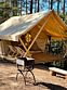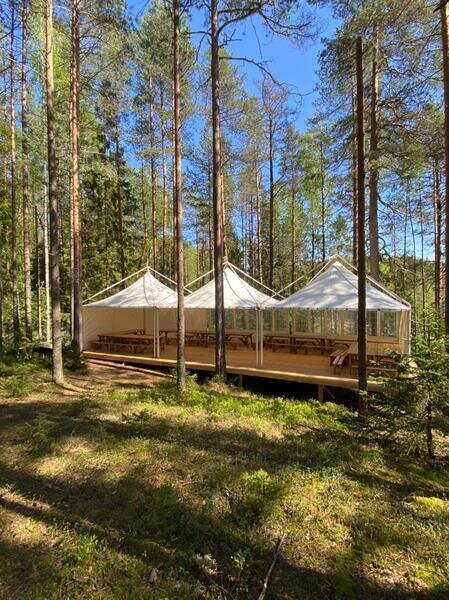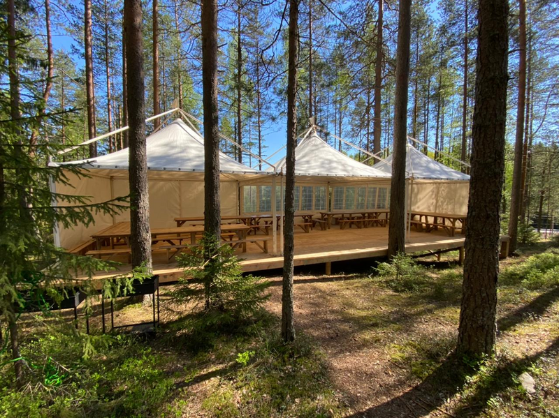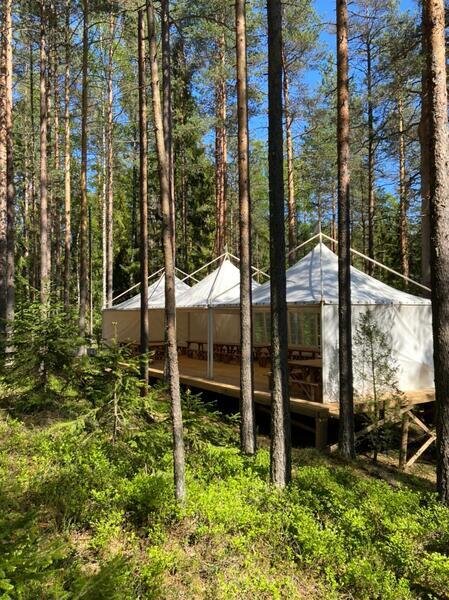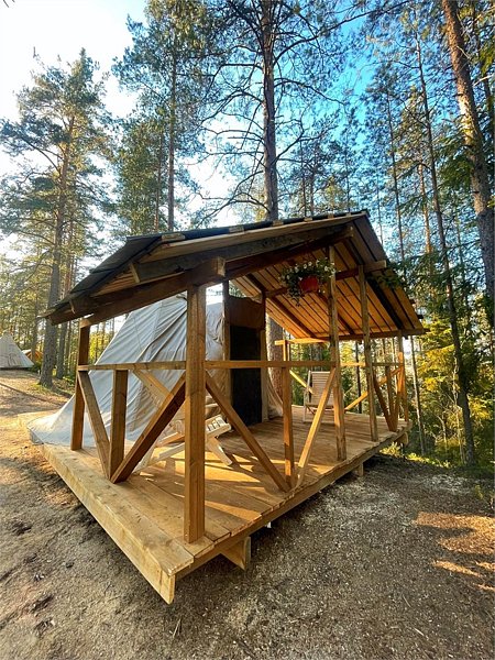 Сафари-тент является современным видом глэмпинга. Тент расположен на вершине холма в сосновом лесу, с видом на озеро, и оборудован мангальным местом, столом и креслами на террасе. Есть возможность размещения третьего гостя на раскладушке за дополнительную плату