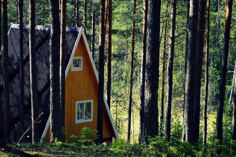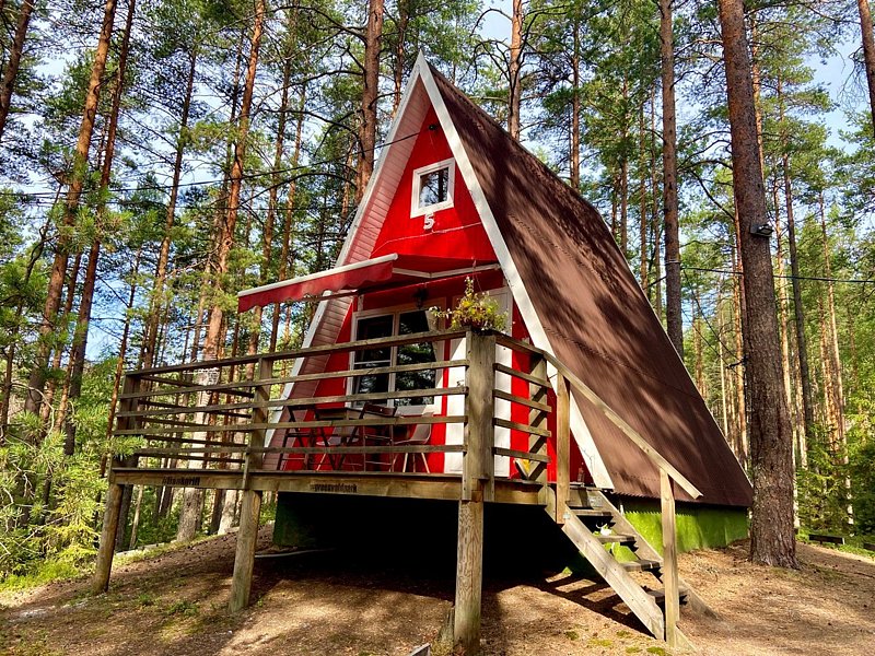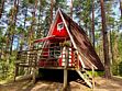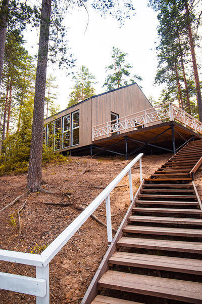 Треугольный коттедж в сосновом лесу с террасой, оборудованной складным козырьком, и видом на озеро. Рядом бесплатная мангальная зона. К домику ведут тропинки, вписанные в ландшафт соснового леса. Аренда коттеджа рассчитана и на холодные сезоны. Помещения утеплены, отопление радиаторами и теплыми полами, есть москитные сетки.