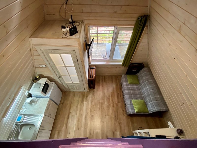 Тайни-Хаус с мангалом, панорамным окном на озеро/реку и потолочным окном над кроватью