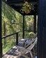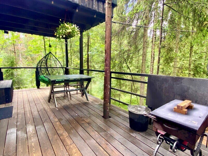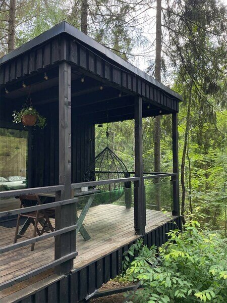 Панорамные окна в пол и потолочное окно над кроватью позволят насладиться звездным небом в ясную погоду или узорами дождя осенним вечером. Часть террасы — крытая (6 м2), что позволит наслаждаться видом и присматривать за шашлыком на свежем воздухе в любую погоду.