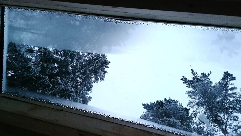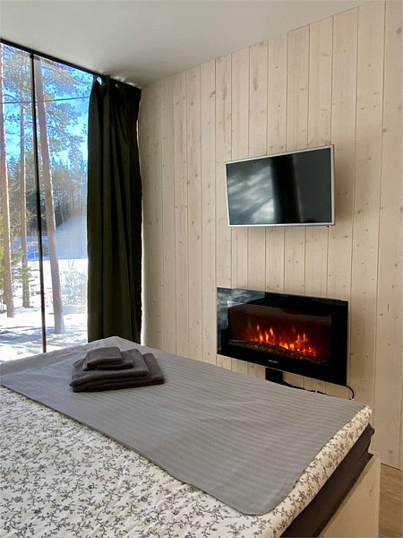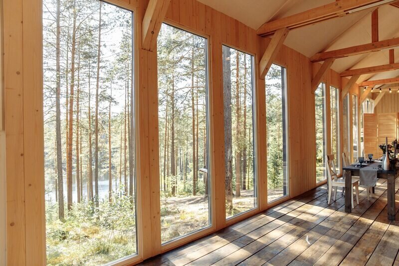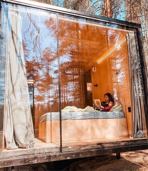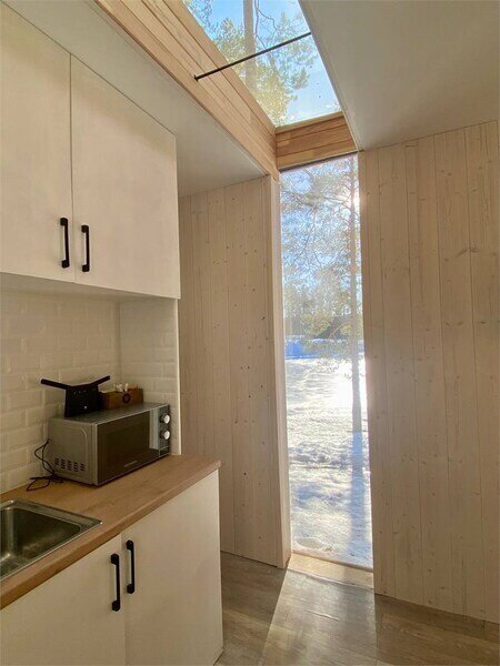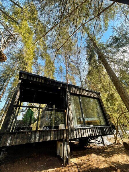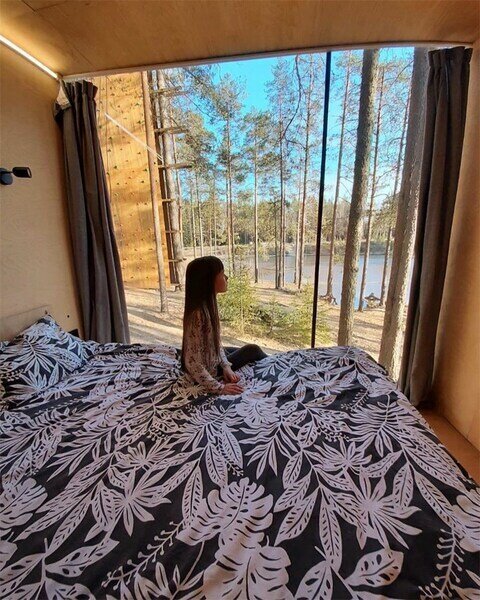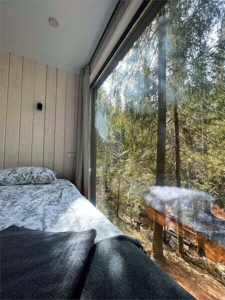 Одним из поводов выбора данного коттеджа является его панорамное остекление во всю стену в спальне с видом на озеро и лес и потолочное окно прямо над кроватью, позволяющее любоваться звездным небом в ясную погоду. Все комнаты оборудованы большими окнами, чтобы при желании в любой момент можно было созерцать окружающий лес, озеро или кроны деревьев. Также к домику ведут тропинки, вписанные в ландшафт соснового леса.
