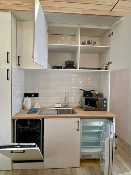 Ривер-Хаус оборудован кухней-гостиной и современной бытовой техникой. Помещение отапливается теплыми полами и оборудовано кондиционером и двумя вытяжками.