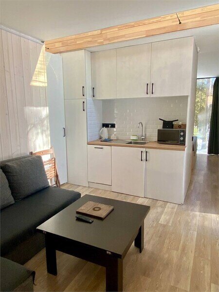Сканди-Хаус — это просторный домик с улучшенными условиями для длительного проживания, лучшими видовыми характеристиками и большей удаленностью от пляжной зоны. Это самый комфортабельный тип размещения, с кухней-гостиной, спальней, прихожей и санузлом.