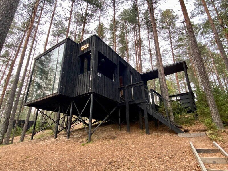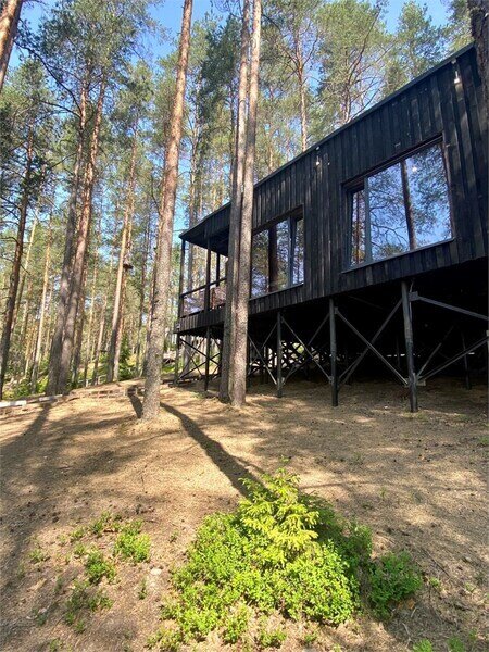 Эко-Дом – это стильный и современный двухкомнатный коттедж в сосновом лесу на берегу живописного лесного озера. Эко-Дом оборудован современной бытовой техникой и построен по энергосберегающим технологиям пассивного дома. Отапливается теплыми полами и конвекторами, оборудован умным светом, посудомоечной машиной, двумя ТВ. Главной изюминкой коттеджа является большое панорамное окно с прекрасным видом на лес и озеро и электрический камин в спальне. Также к домикам ведут тропинки, вписанные в ландшафт соснового леса.