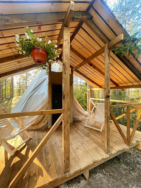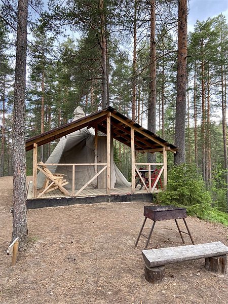 Типи расположен в сосновом лесу на вершине холма с видом на озеро и оборудован собственным мангальным местом и столом со стульями на террасе. В типи есть возможность размещения третьего гостя на раскладушке за дополнительную плату с завтраком.