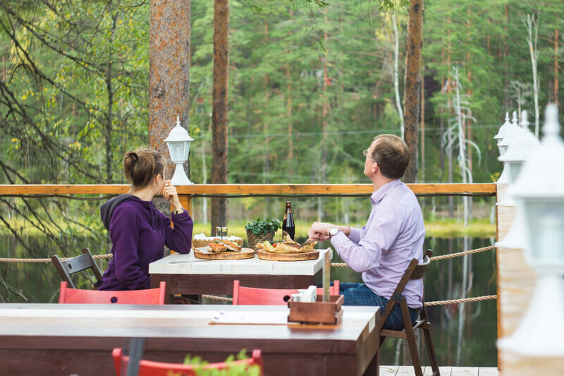 Панорамный ресторан FLANK Grill & BBQ открыт с 10:00-21:00 ежедневно, предлагает завтраки с 10:00-12:00. Меню включает скандинавские и европейские блюда, в зимнее время в ресторане топится дровяная печь, создавая уют и тепло. В ресторане можно провести время за настольными играми, воспользоваться бесплатным Wi-Fi. Летом гости могут насладиться превосходными блюдами в пространстве ресторана или на открытой веранде с видом на лесное озеро. Для детей имеется зона отдыха с телевизором, игрушками и принадлежностями для рисования.