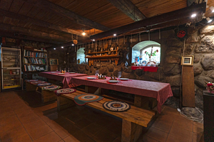 Территория уютная – чувствуешь себя как на даче: огород (овощи из которого будут на вашем столе), цветники, подстриженные зеленые газоны, яблони, ели, маленький пруд и живописная тропинка, ведущая к нему. В гостевом доме всё говорит об истории, от каменной кладки дома до старинного интерьера ресторана, от музея и библиотеки до предметов, найденных при раскопках на месте хутора. Хозяин Владимир Борисович знает много интересных фактов из истории этих мест.