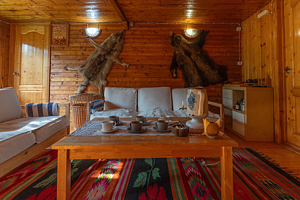 После парения отдыхайте с удовольствием в просторной комнате отдыха с камином и самоваром под ваши любимые фильмы экране телевизора, или просто наслаждайтесь неторопливой беседой.