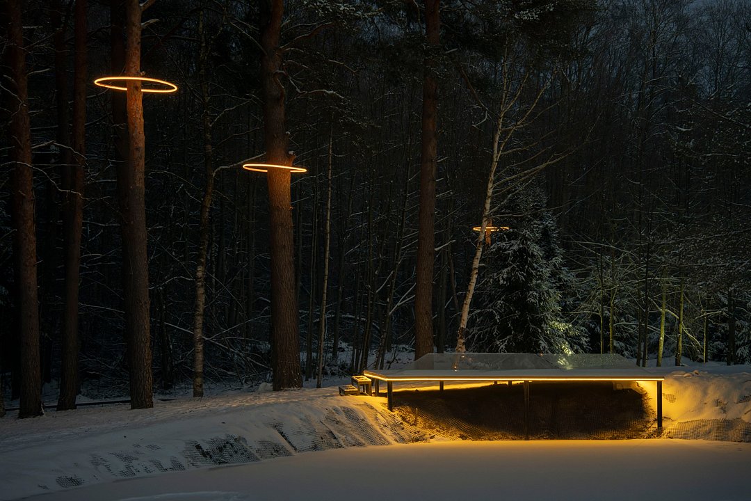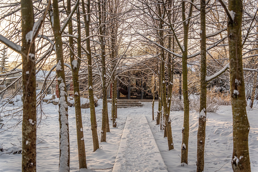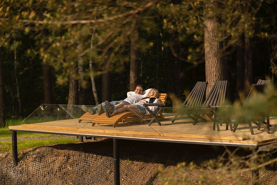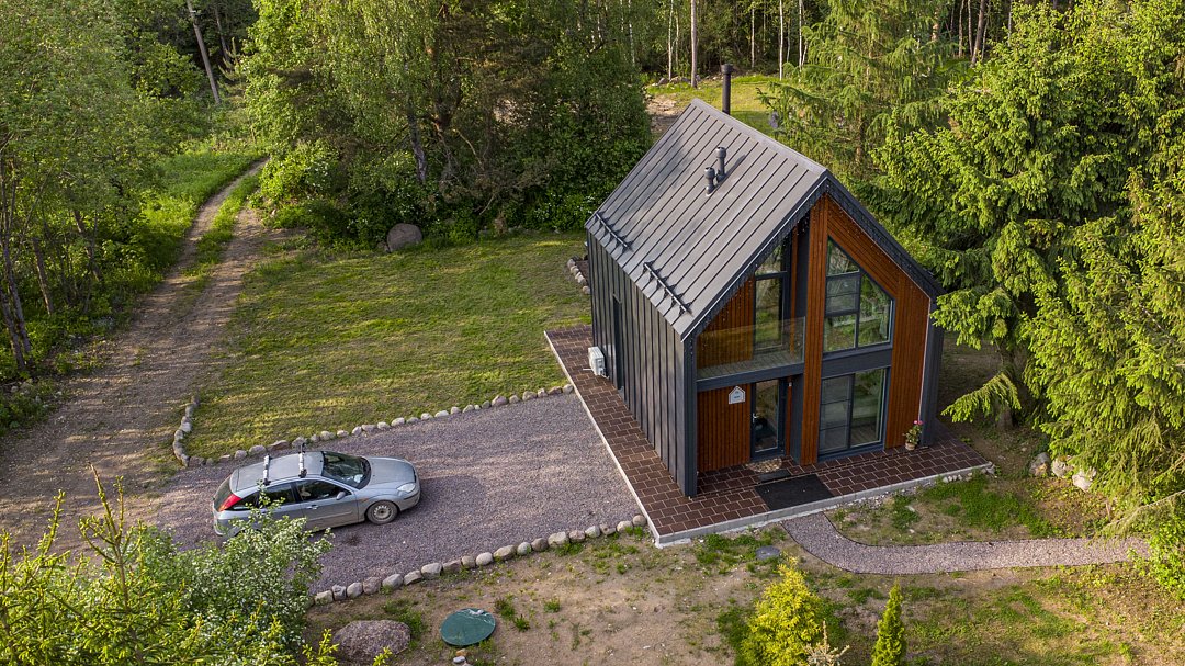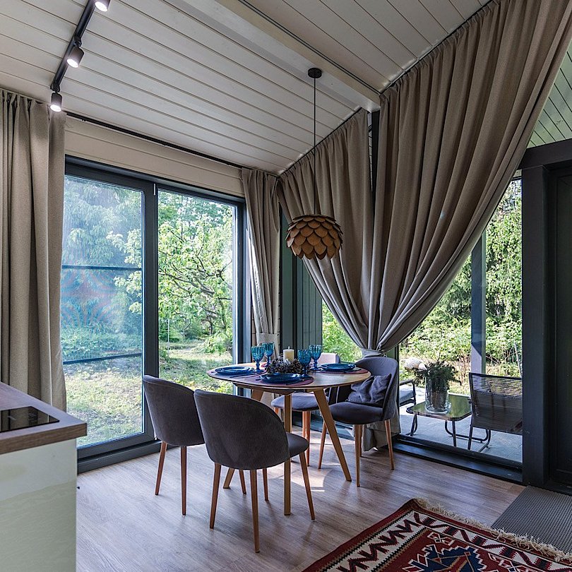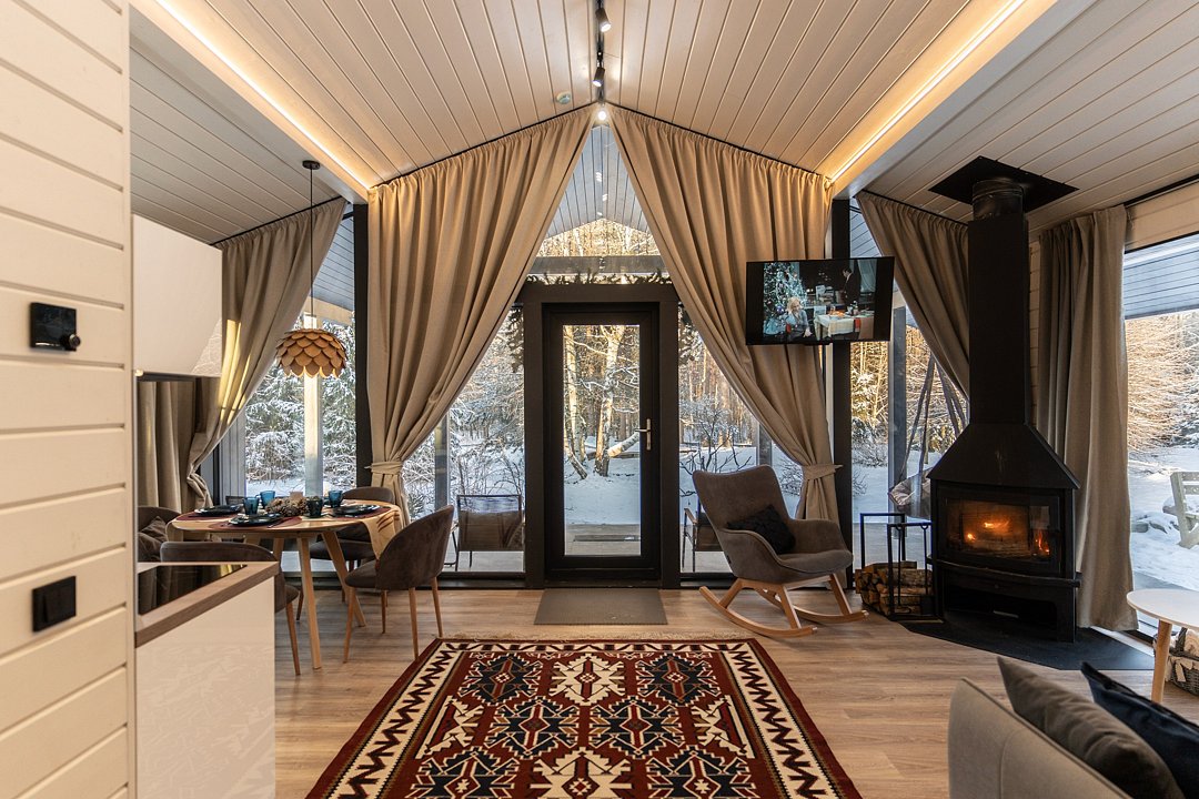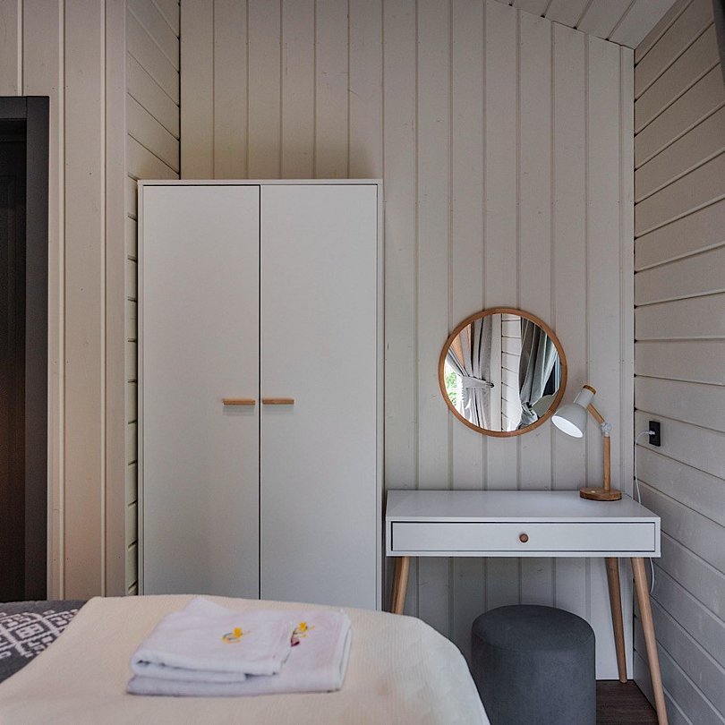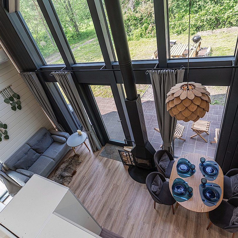 - 2 спальни: одна отдельная на 1 этаже, вторая — открытая с видом на лес;