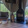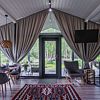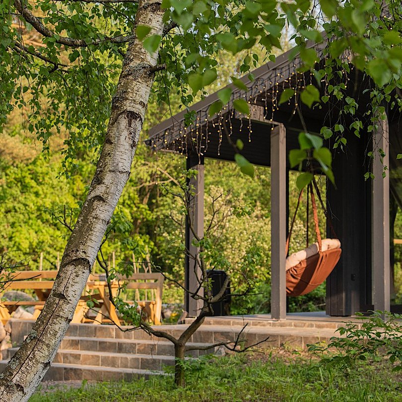- терраса с гамаком, диванчиком и креслами под крышей;