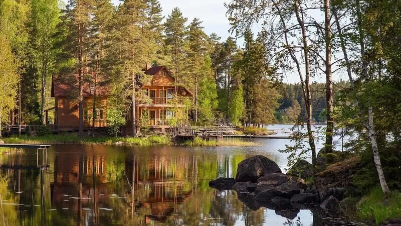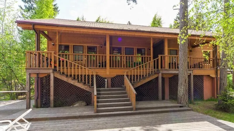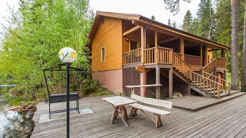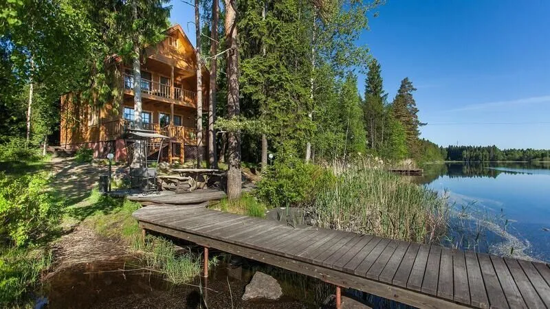 Уютный двухэтажный коттедж на самом берегу озера. Гостиная с настоящей дровяной печью. Зона барбекю с великолепным видом на озеро расположена прямо у воды.