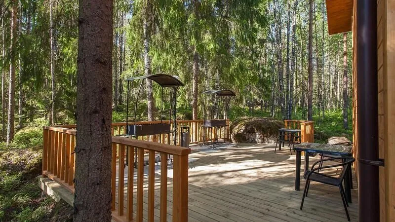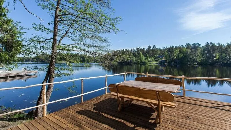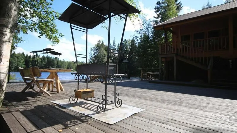 Новая двухэтажная вилла с пятью спальнями и сауной. Зона барбекю с изумительным видом на озеро. Просторная кухня-гостиная с обеденным столом на 12 человек и огромным диваном. Прямо из гостиной можно попасть на открытую террасу со столом и лавками.