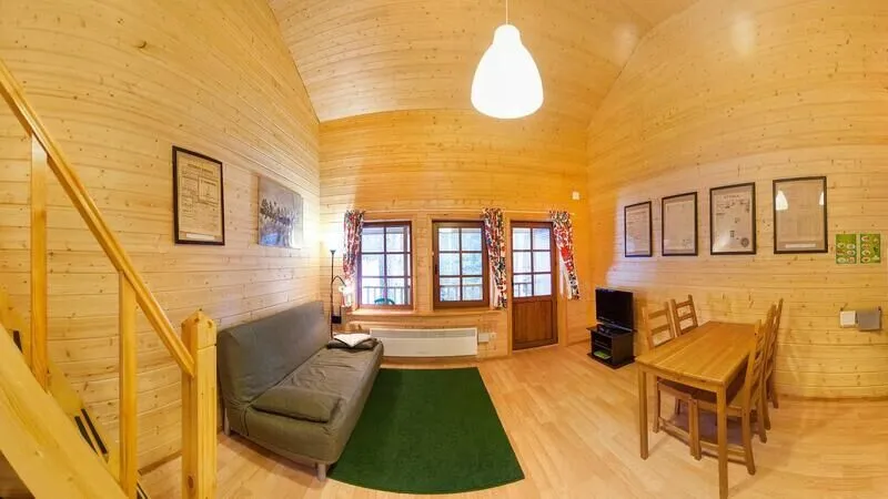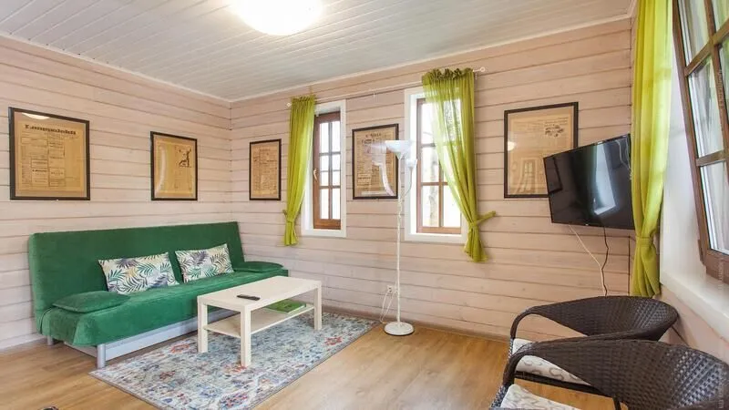 - В гостиной имеются два раскладных дивана, журнальные столики, большой ЖК-телевизор и электрокамин. Прямо из гостиной можно попасть на открытую террасу с большим столом и лавками;