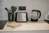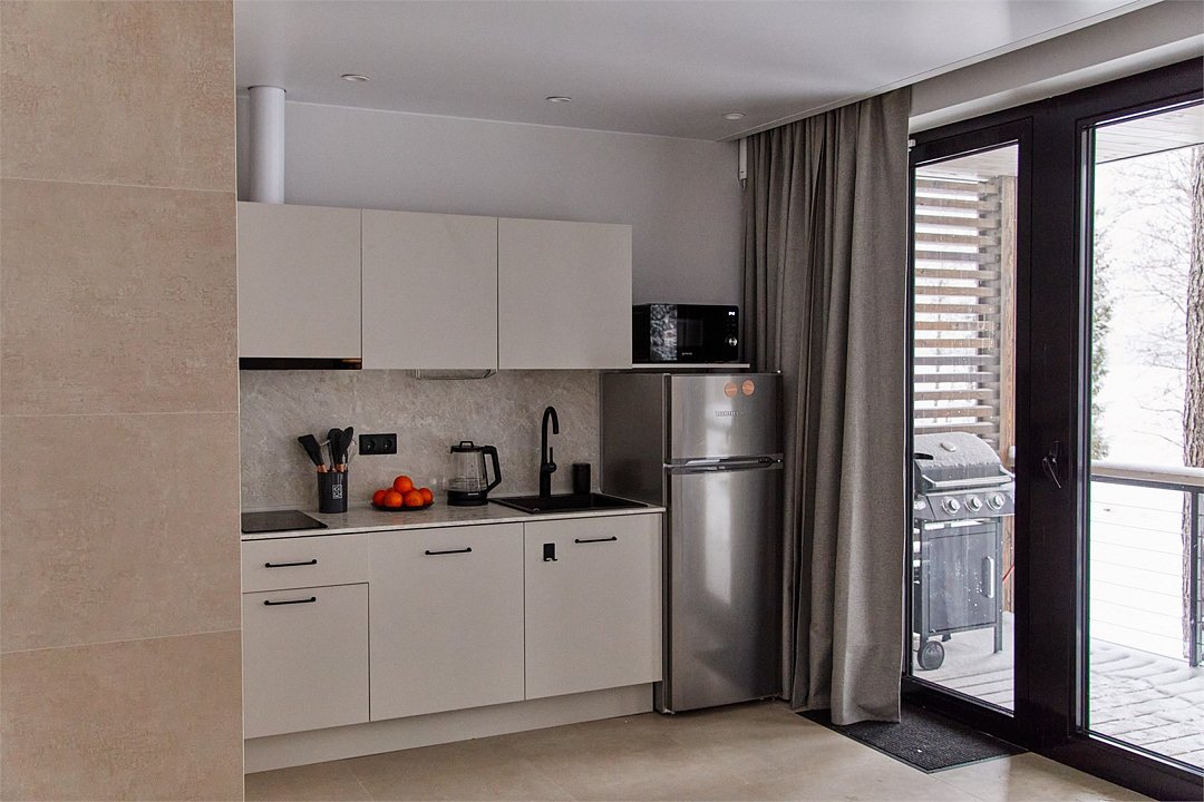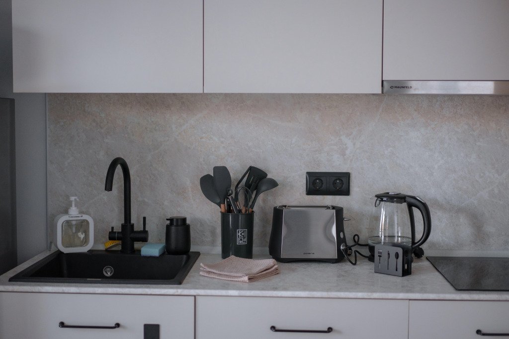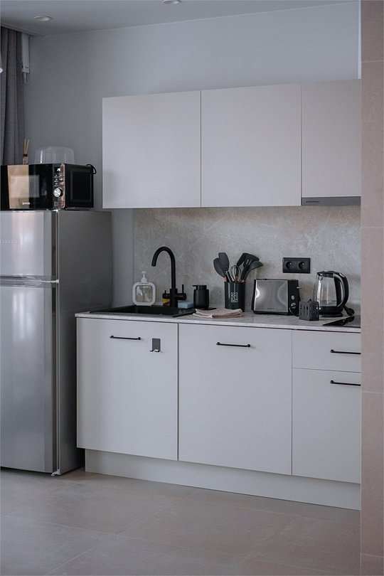 - Кухня: индукционная плита, микроволновая печь, электрический чайник, тостер, холодильник с морозильной камерой, посудомоечная машина, таблетки для посудомоечной машины, моющие средства, посуда