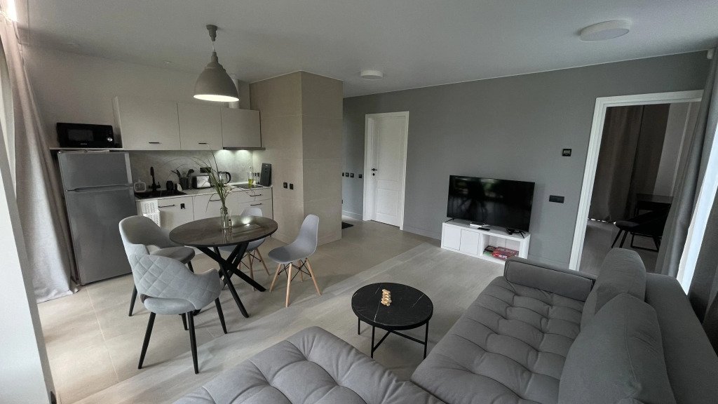Апартаменты с большой гостиной, двумя спальнями, просторной террасой и потрясающим видом на озеро Пионерское. Если Вы собрались на отдых семьей или большой компанией - это именно тот дом, который Вам нужен.