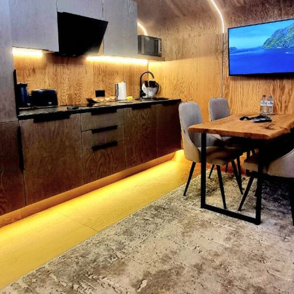 В гостевой удобная угловая кухня, обеденная группа, комфортабельный двуспальный диван, ниши для чемоданов и сумок.