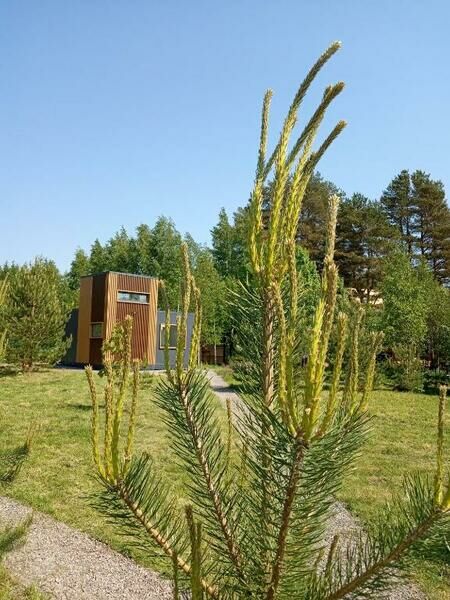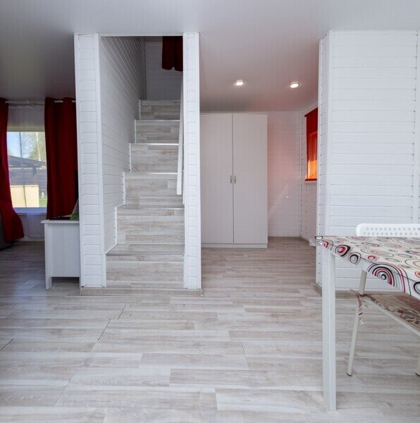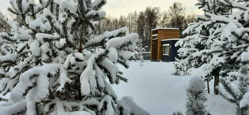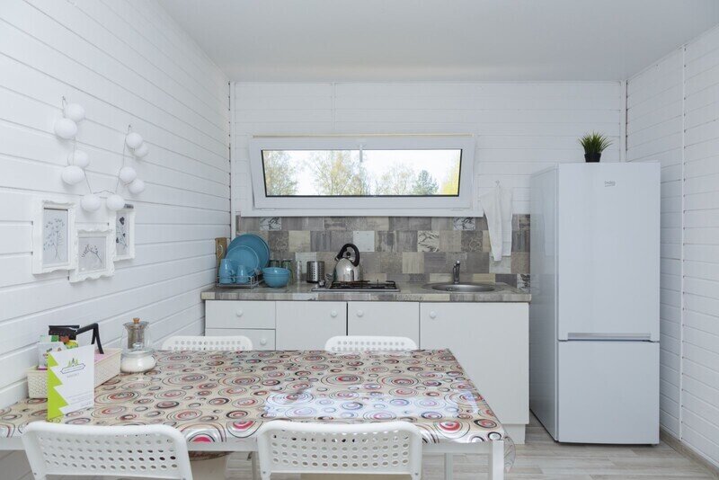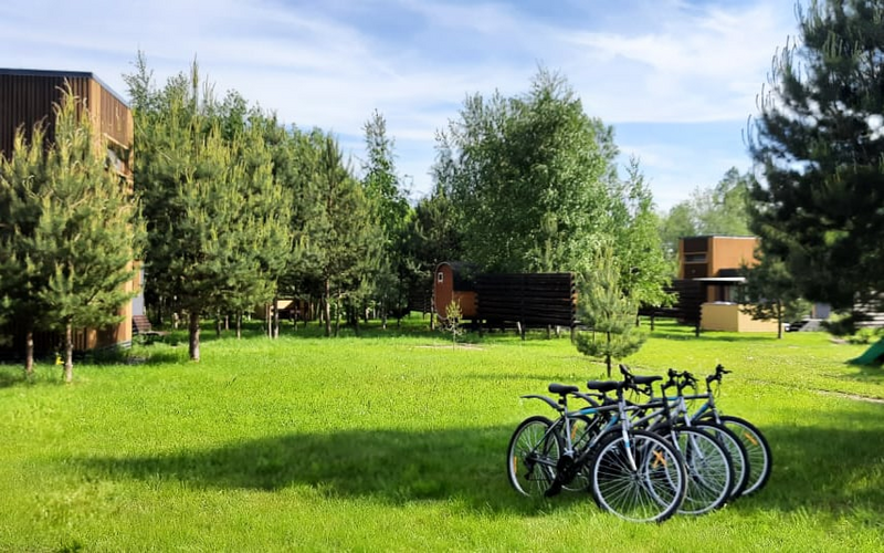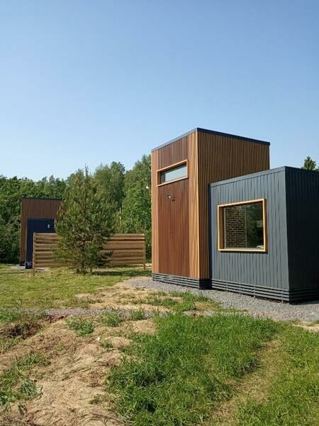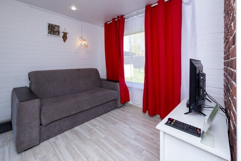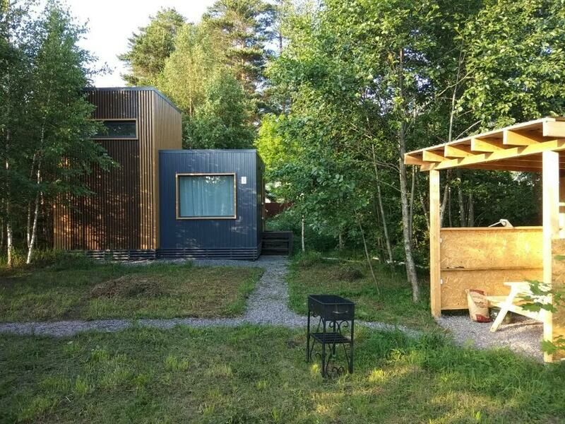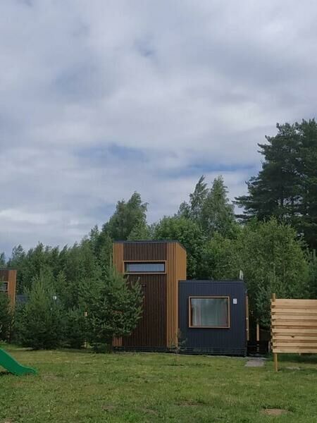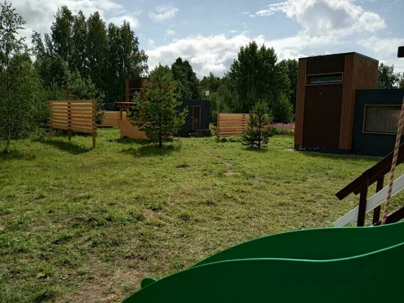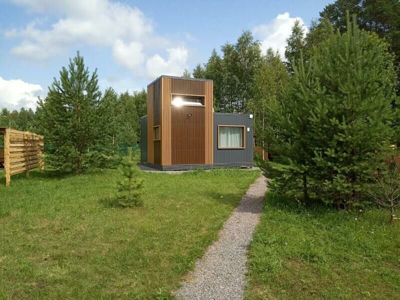 Коттеджи выполнены в стиле лофт со скандинавским минимализмом. Рядом с каждым домиком беседка, гамак и мангал.