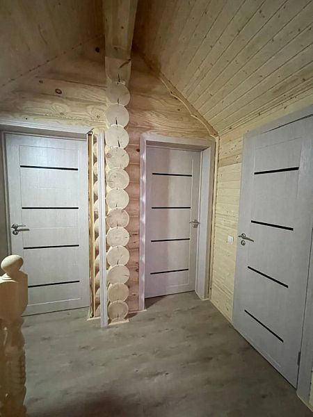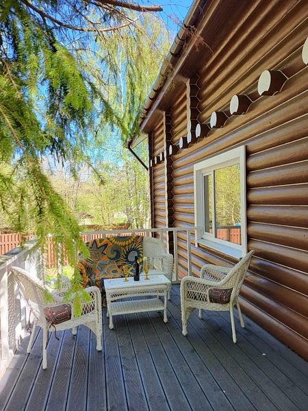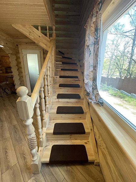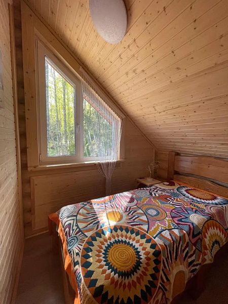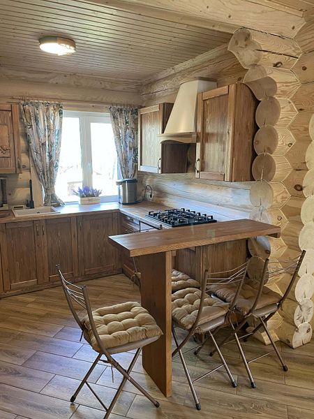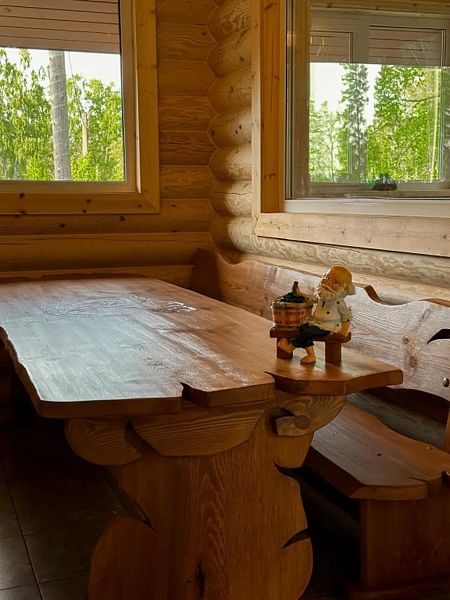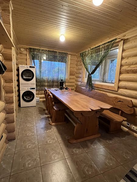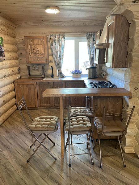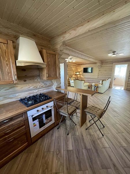 В доме большая кухня-гостиная, два санузла и три спальни на втором этаже с 2-мя двуспальными кроватями, и 4-мя односпальными. Для наших гостей: постельное бельё, полотенца. Теплые полы (также есть электрические обогреватели). Душ, туалет, фен, горячая вода. Оборудованная кухня: вся посуда, плита газовая, холодильник, чайник, микроволновка, кофеварка капельная для молотого кофе, посудомойка. Терраса с мебелью.