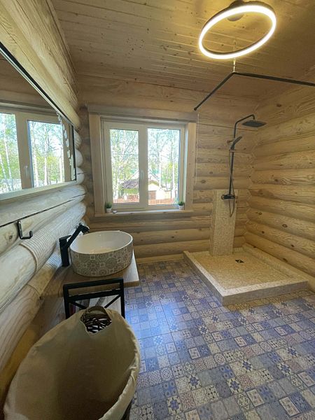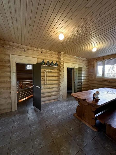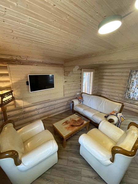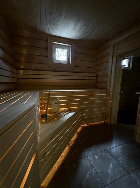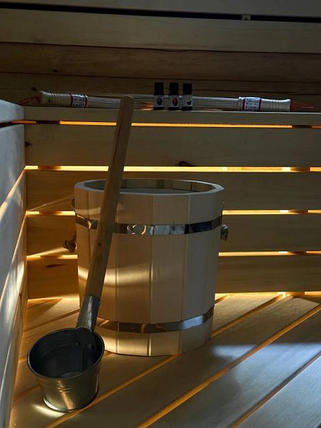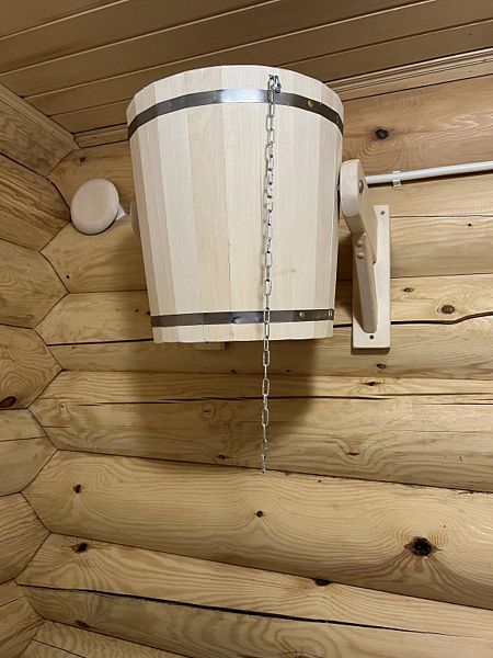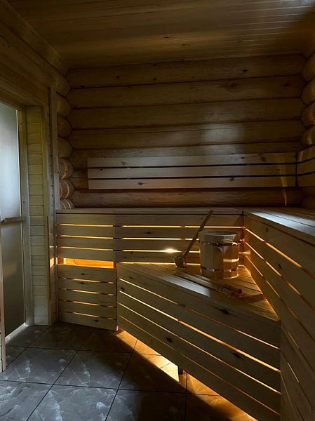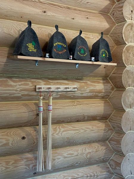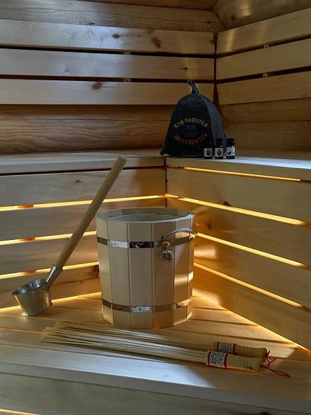 Инфраструктура: зона отдыха, шапочки, обливное ведро, березовые веникиБольшая баня 50 кв. м. с ведром-водопадом - одно посещение в подарок! Веники - 600₽, вязанка дров 12кг - 500₽.