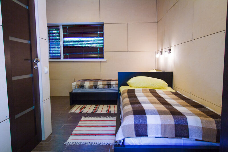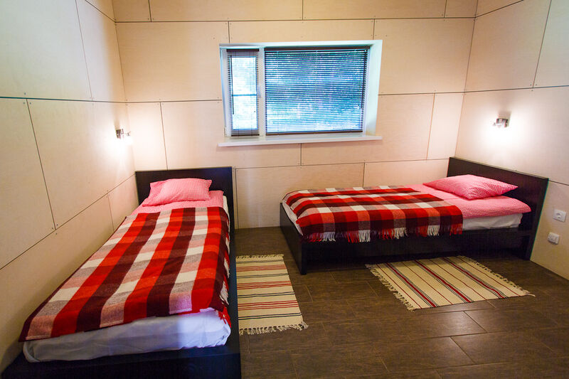 Каждый домик рассчитан на шесть человек. В Доме две комнаты и гостиная с кухней, электрическое отопление, санузел: душ, унитаз, раковина, зеркало, холодная и горячая вода.