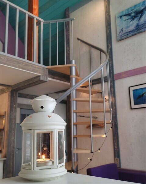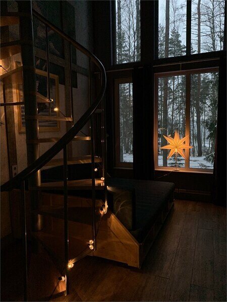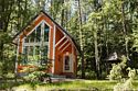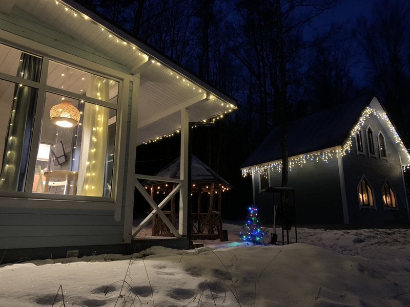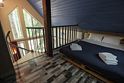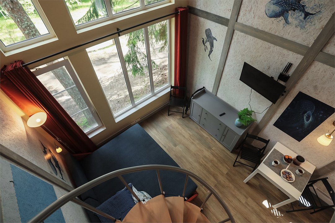 Коттедж оборудован всем необходимым для комфортного размещения четырех человек или семейной пары с двумя детьми. На втором этаже двуспальная кровать, на первом — двуспальный диван-кровать. Дополнительно можно установить кроватку-манеж. Комфортная температура поддерживается за счет пола с электроподогревом.