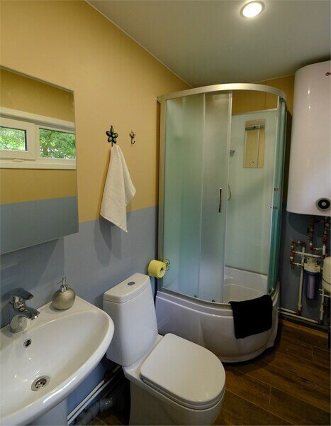 - санузел (централизованной водоснабжение, бойлер, душевая кабина, унитаз, раковина, шкафчик с зеркалом),