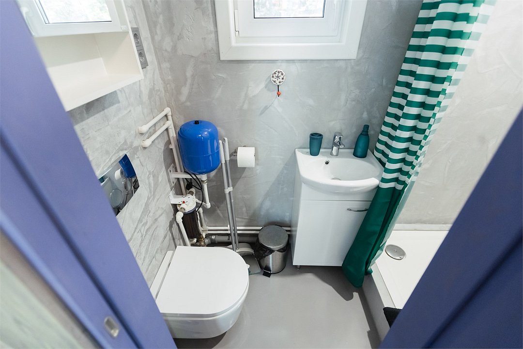 - санузел (централизованное водоснабжение, бойлер, душевая кабина, унитаз, раковина, шкафчик с зеркалом),