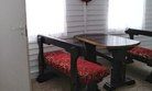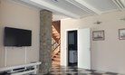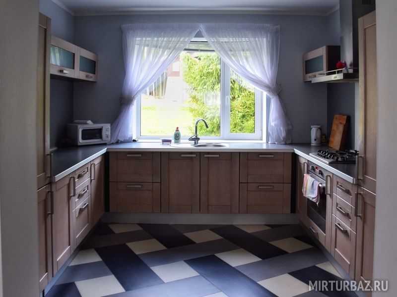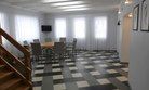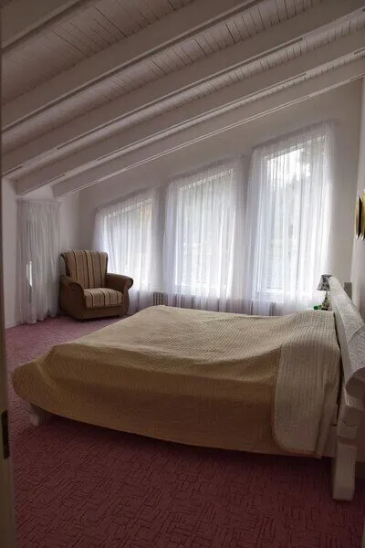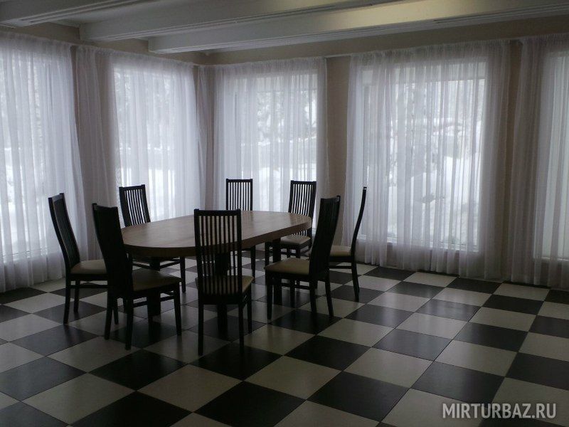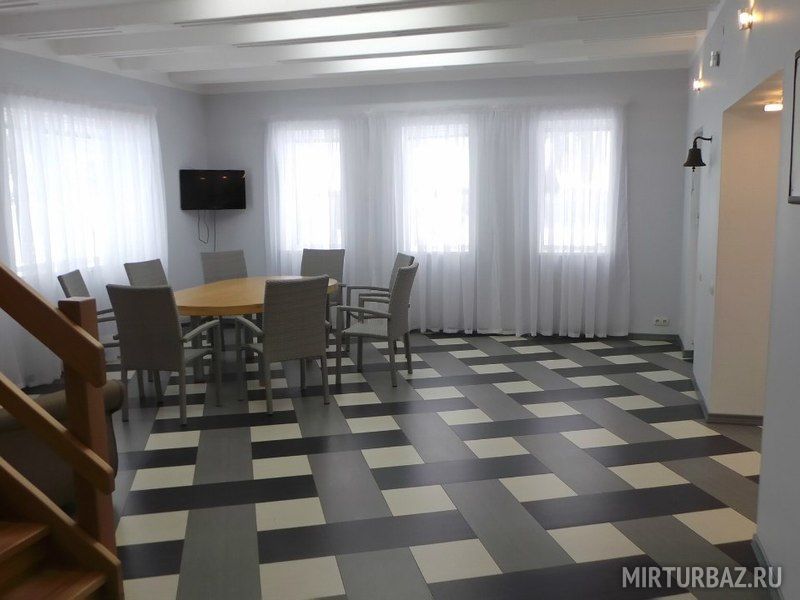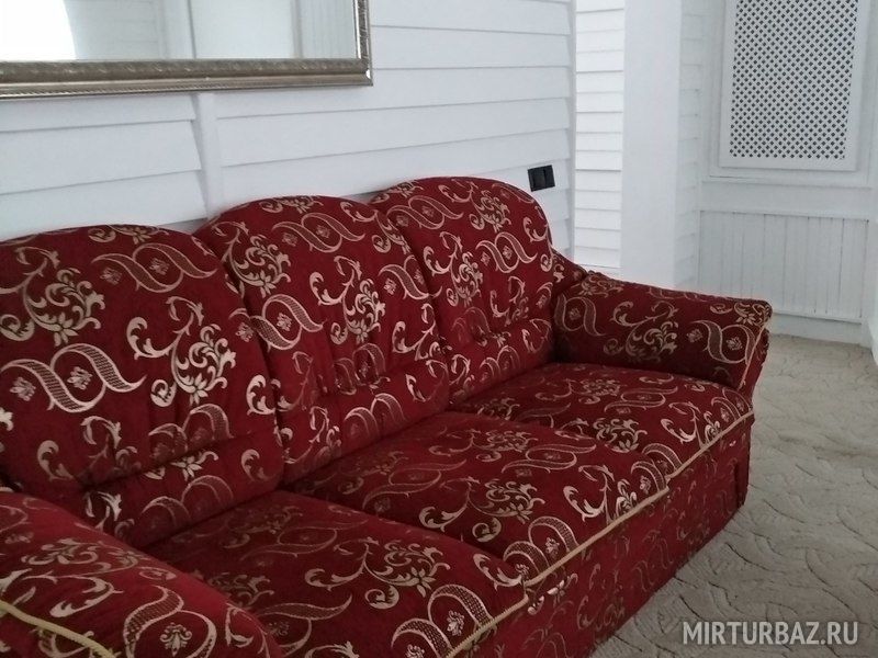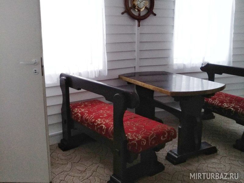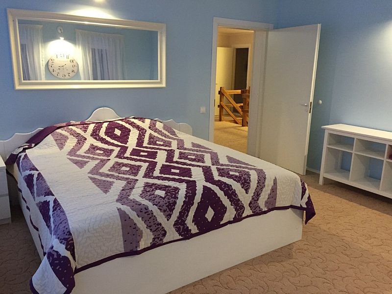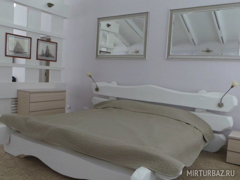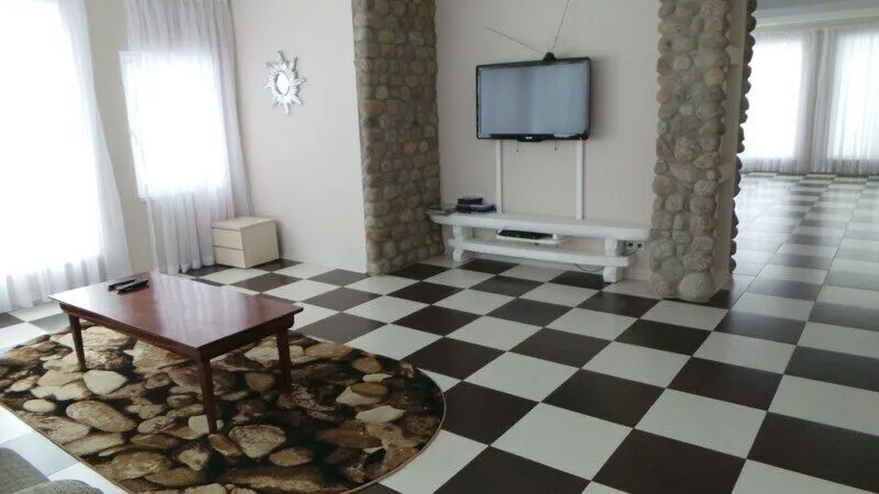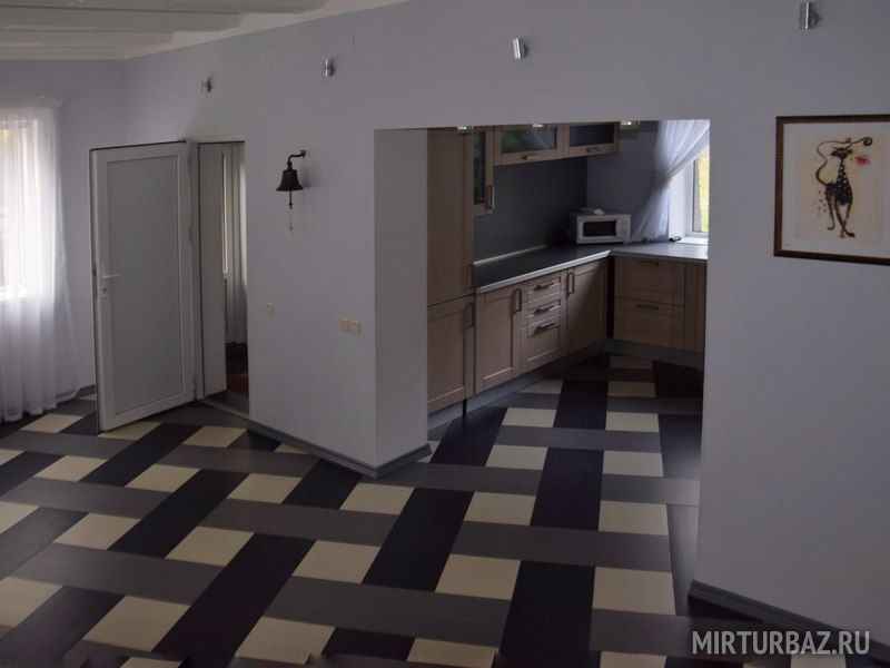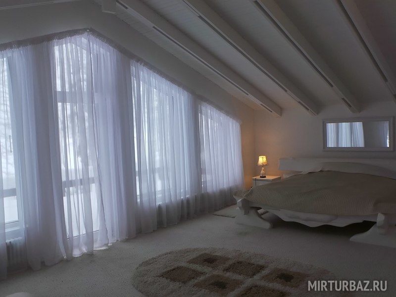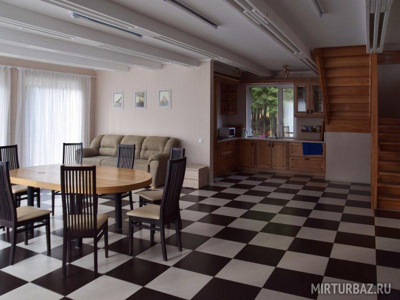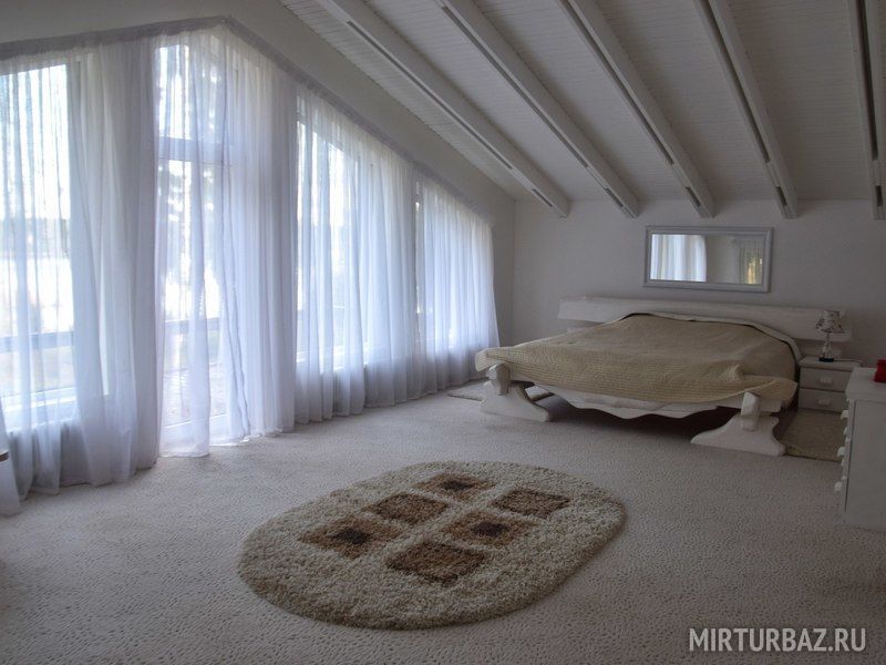 На первом этаже: прихожая, гостиная-столовая, кухня, комната отдыха, русская баня, туалет, душ. Везде теплый пол. На кухне: газовая плита, холодильник, чайник, микроволновка, раковина-мойка посуда, столовые приборы. В гостиной стоит обеденный стол и 10 стульев. На втором этаже: 5 спален, туалет, душ. 4 спальни: кровать "king-size". 1 спальня: 2 односпальные кровати.