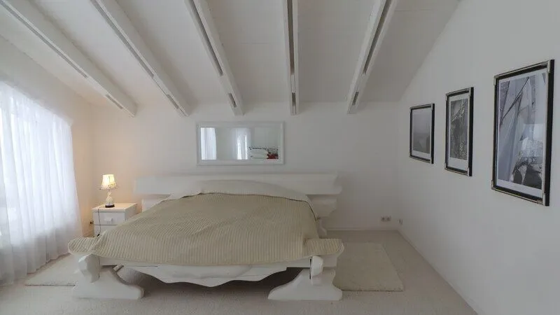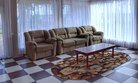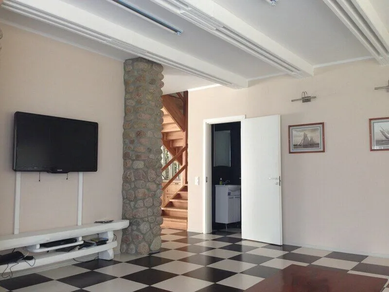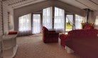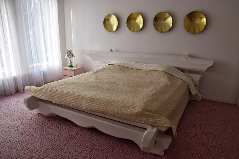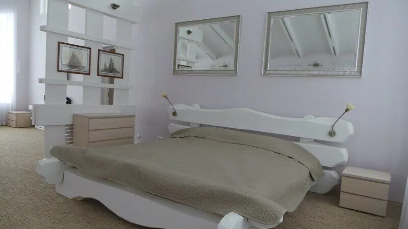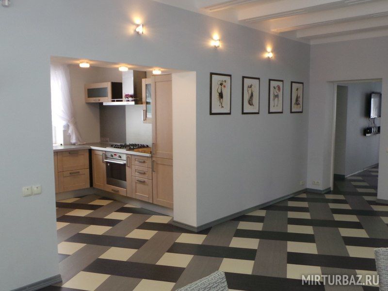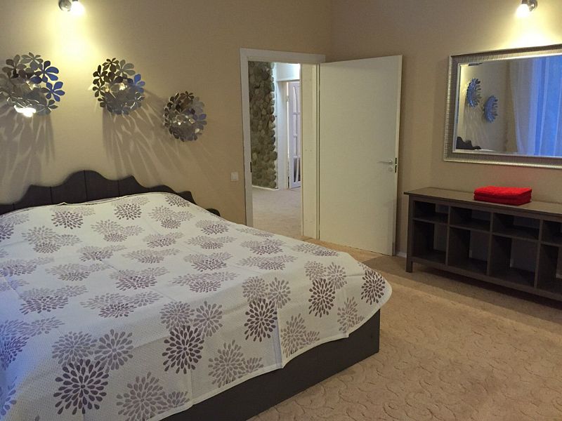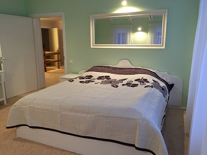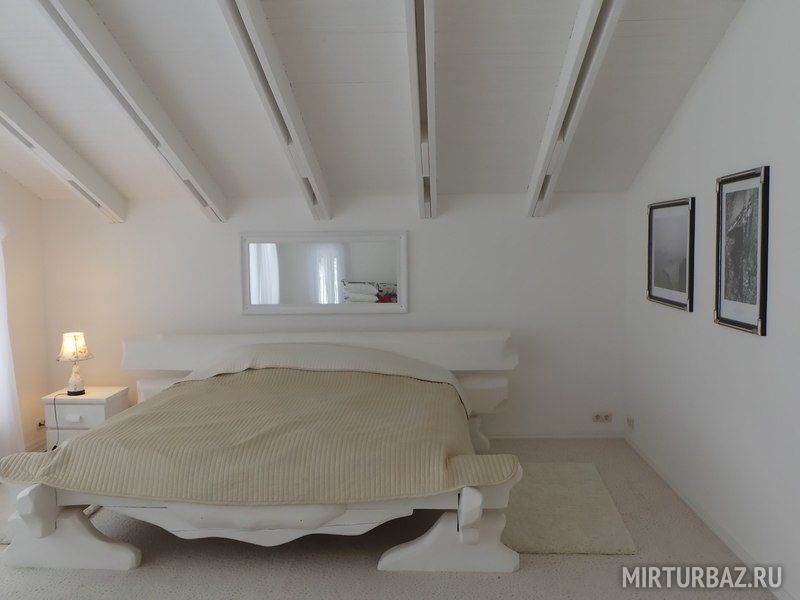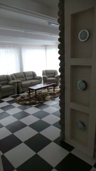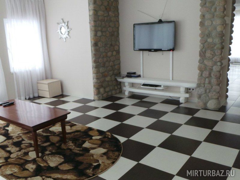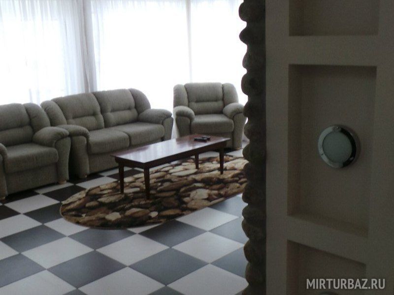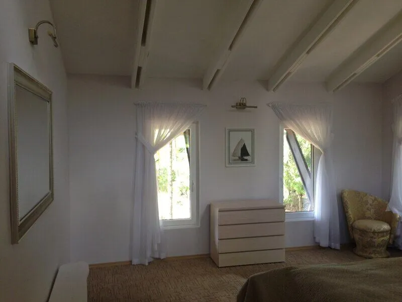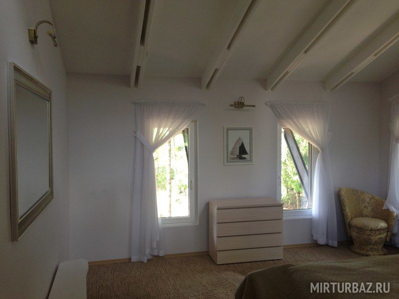 На первом этаже: прихожая, гостиная - столовая, кухня, комната отдыха, русская баня, туалет, душ. В гостиной стоит обеденный стол и 8 стульев. На кухне: газовая плита, духовка, холодильник, чайник, посуда, столовые приборы, раковина-мойка. В комнате отдыха: TV, DVD, диван, два кресла, журнальный столик. Везде подогреваемый пол. На втором этаже: три спальни В большой спальне: кровать «king size», раскладной диван, два кресла, журнальный столик, комод, туалет, душевая кабинка В двух других спальнях: кровать «king size», две тумбочки, комод, кресло.