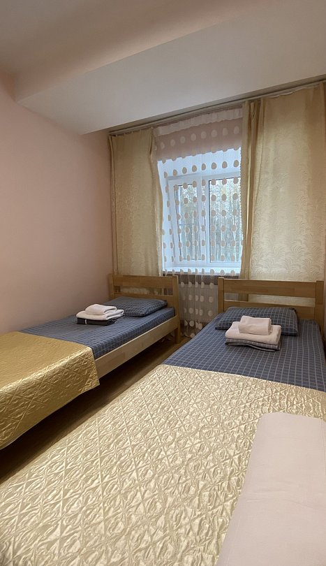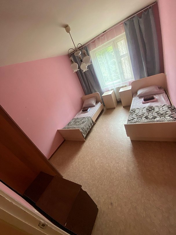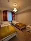 В номере 2 комнаты с небольшой прихожей, санузлом и душевой. В одной комнате - 2 односпальные кровати, во второй комнате – 1 односпальная кровать. Имеется тумбочка, плоский ТВ, шкаф. В некоторых номерах есть балкон и мини-холодильник. Напольное покрытие – ламинат. Номера расположены на 2 этаже главного корпуса. В каждом номере телевизор, душевая кабина, косметический набор входит в стоимость. На этаже есть кулер с холодной и горячей водой.