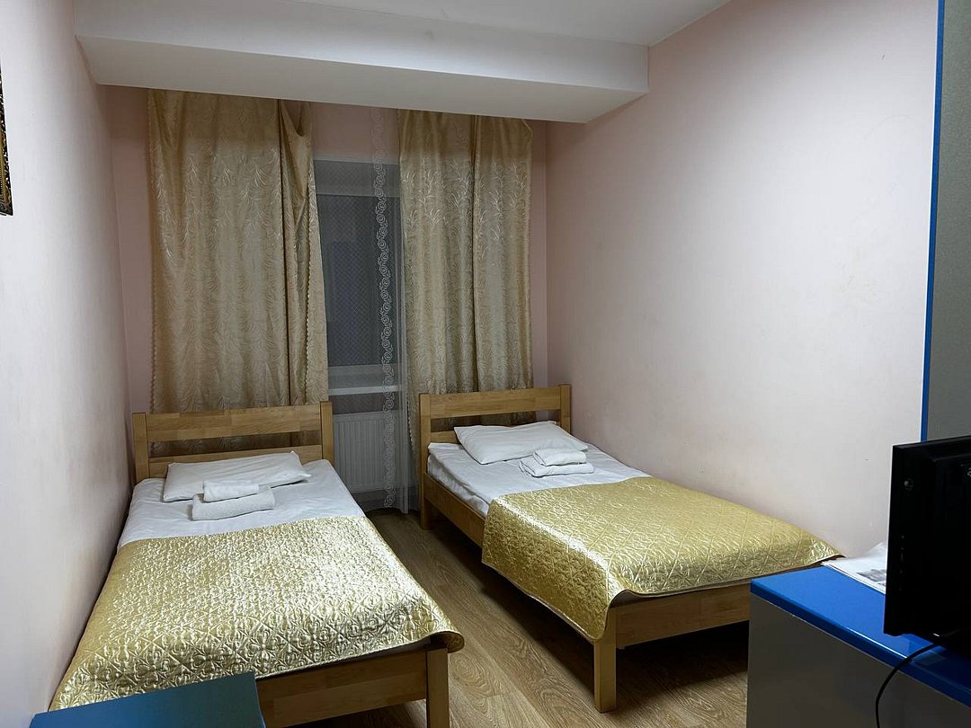 В номере небольшая прихожая, 1 комната с двумя односпальными кроватями, между ними тумбочка. Имеется плоский ТВ, шкаф, тумба, санузел с душевой, в некоторых номерах есть балкон и мини-холодильник. Напольное покрытие – ламинат. Номера расположены на 1 и 2 этаже главного корпуса. В каждом номере телевизор, душевая кабина, косметический набор входит в стоимость. На этаже есть кулер с холодной и горячей водой.
