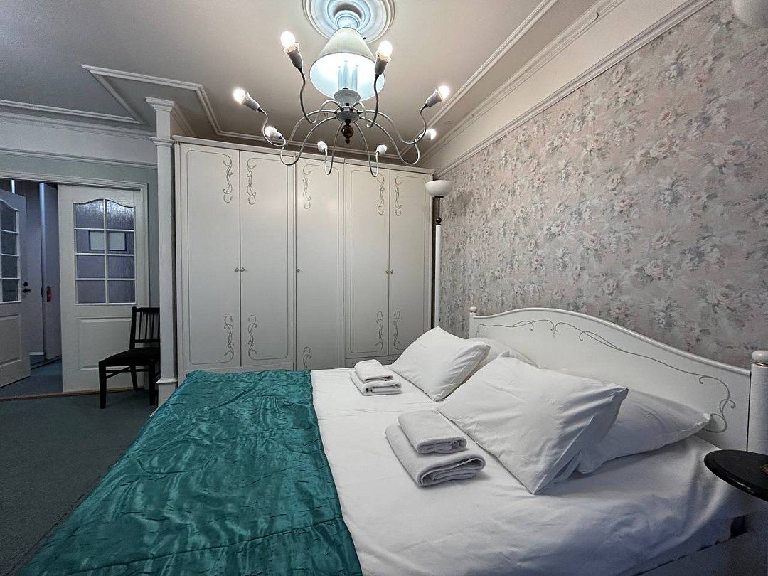 В номере: спальня с большой кроватью (160х200 см), вторая спальня с односпальной кроватью и письменным столом, гостиная с мягкой кожаной мебелью и плоским телевизором.