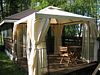 Шатер для большого праздника: В окружении сосен, уединенно расположен большой шатер 6*8 метров. В нем могут разместиться за столами до 30 человек. Возможность подключить аудио и видео аппаратуру.