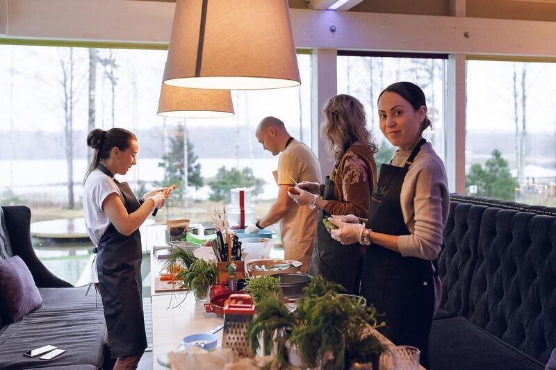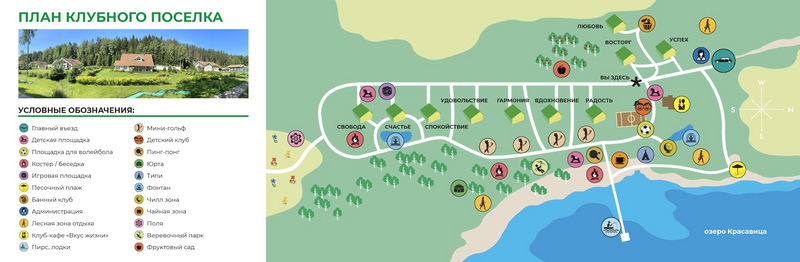 В качестве развлечений для гостей: банный клуб, Спа, йога, мастер–классы, прокат снегоходов, квадроциклов, лодок, лазертаг, квесты, рыбалка, детские и спортивные площадки и многое другое.