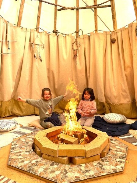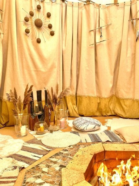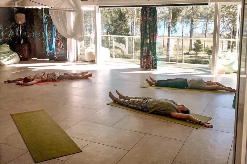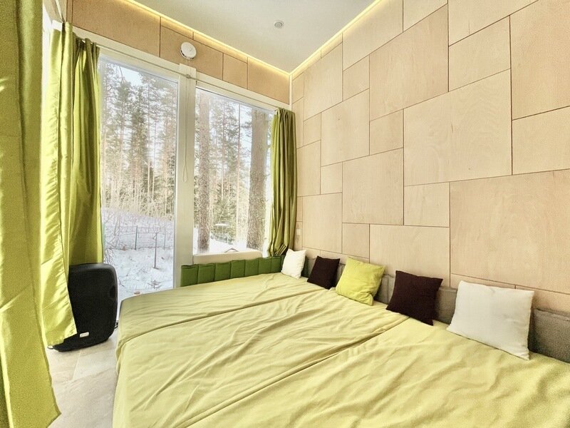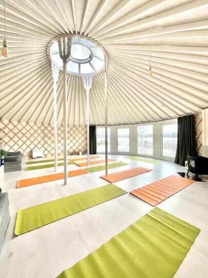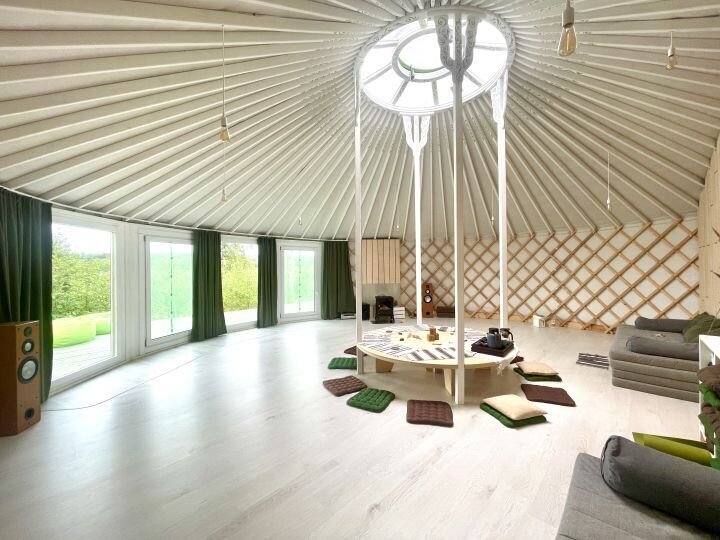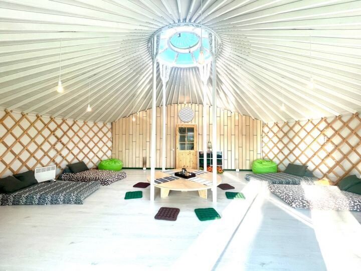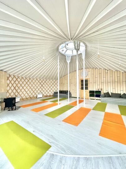 Пространство Юрты наполнено воздухом — благодаря панорамным окнам с видом на озеро, светлым стенам и высокому потолку с круглым окном, через которое во время вечерних практик можно любоваться звёздами. Мягкие напольные матрасы для комфортного сна. Уютная юрта с камином — настоящее единение с природой.