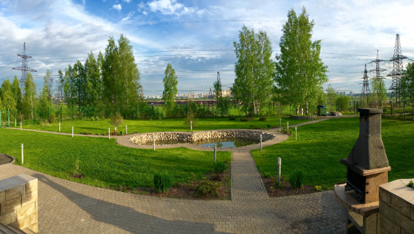 Благодаря высокому расположению, с участка размером 20 соток открывается вид на Санкт-Петербург. Участок с ландшафтом, газоном и прудом с фонтаном.