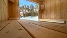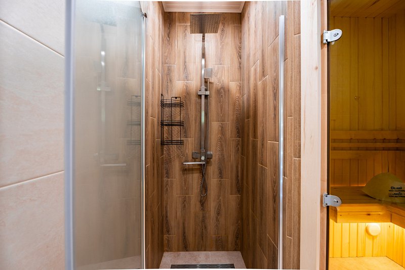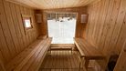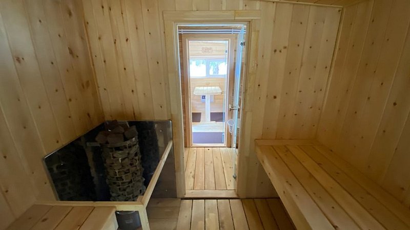Это не просто сауна, а с настоящей финской каменной электропечью и панорамным видом на пруд. Максимальная температура печи — 110 градусов, вместе с тем, можно и нужно использовать аромамасла и поддавать на камни.