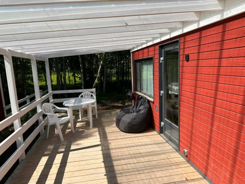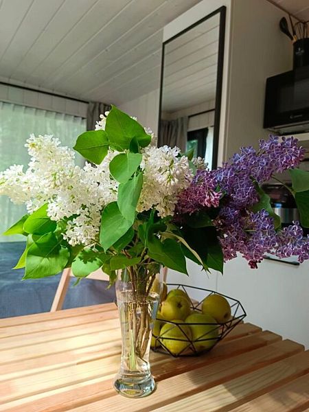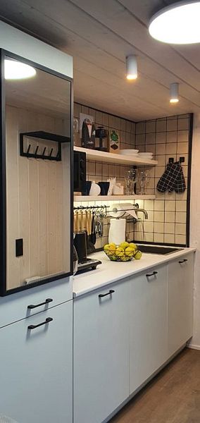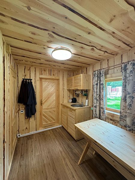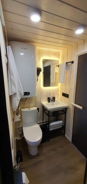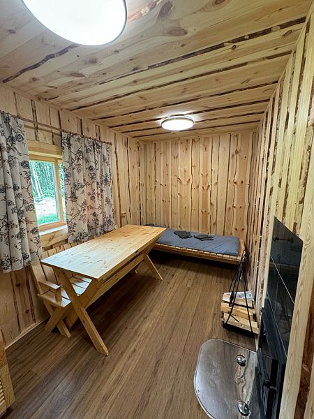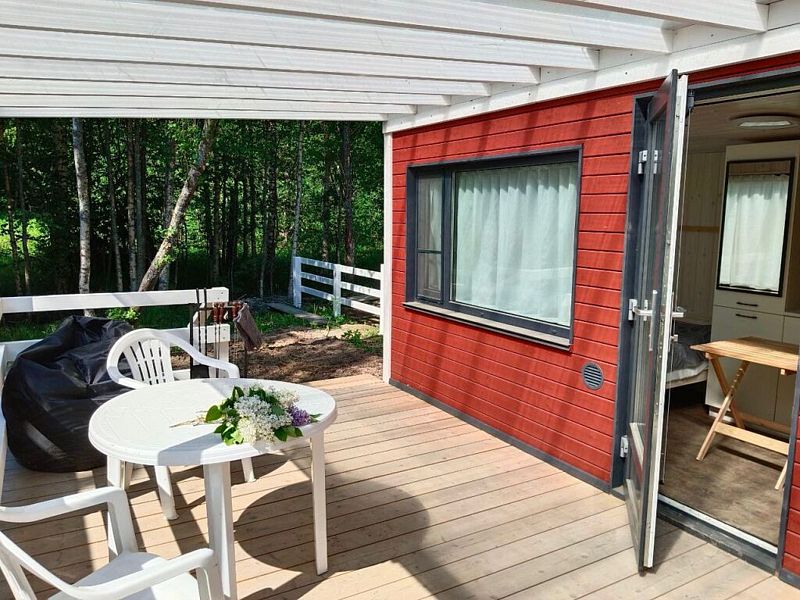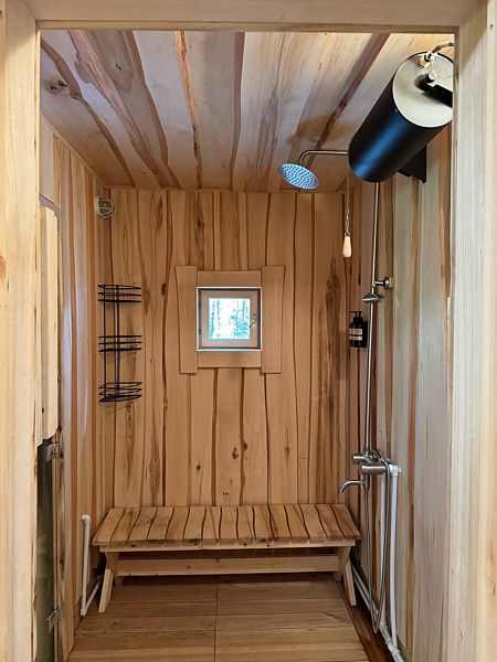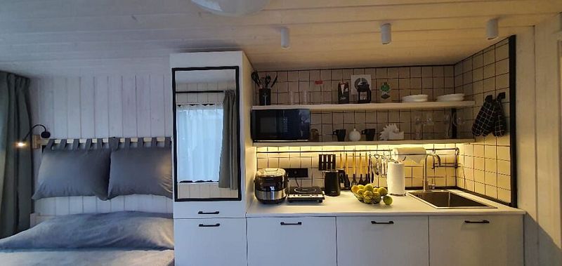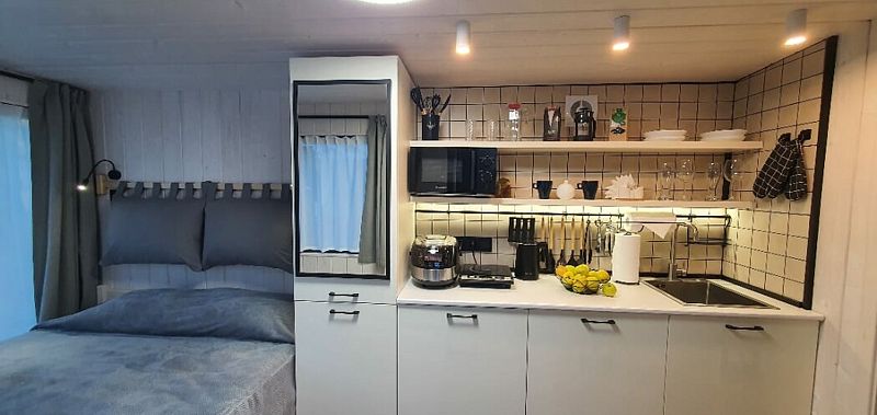 В доме обеспечено все для комфортной жизни: двуспальная кровать шириной 160 см с панорамным окном на лес; кухонная зона с раковиной, подсветкой рабочего пространства, мини-холодильником, электрическим чайником, индукционной плитой, мультиваркой, СВЧ-печью, полным набором посуды, вытяжкой, всем необходимым для приготовления пищи; шкаф для хранения вещей и одежды; санузел с душевой кабиной, унитазом, раковиной, феном для волос, гелем для душа.