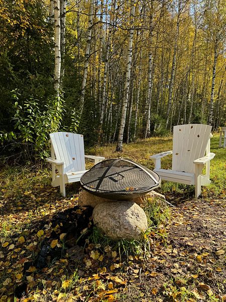 Крытая терраса площадью 15 м со столом и стульями; индивидуальная зона за домом; костровая зона с костровой чашей, креслами, набором для гриля и шашлыка
