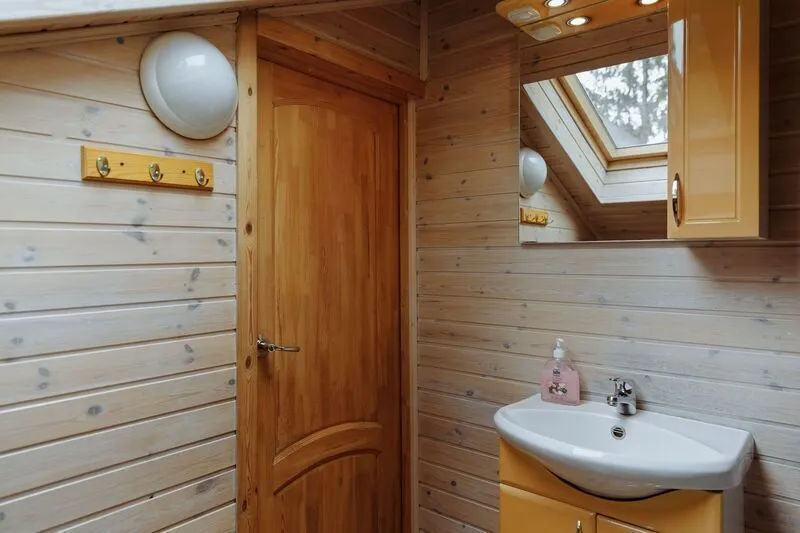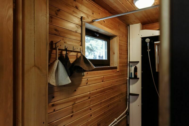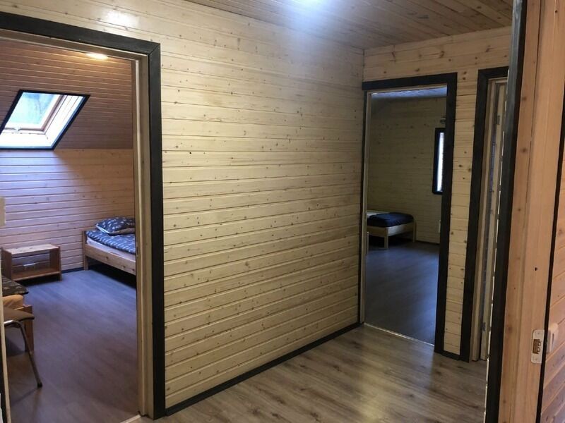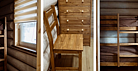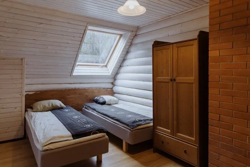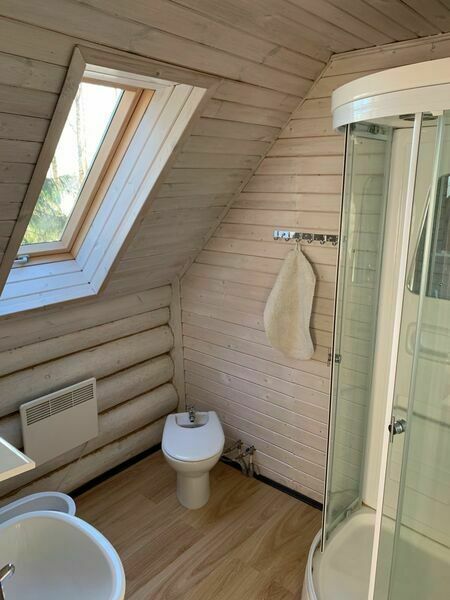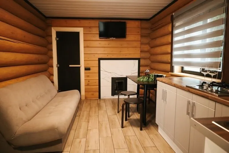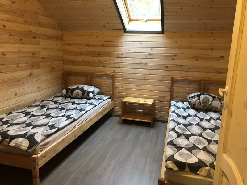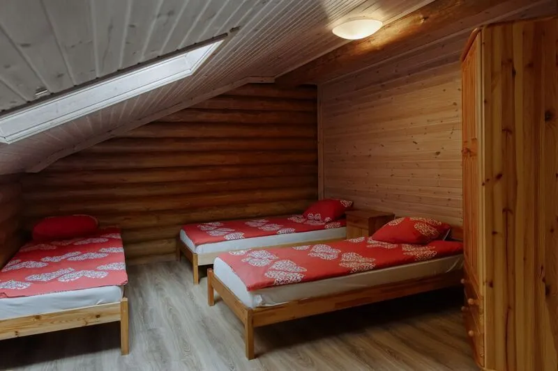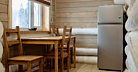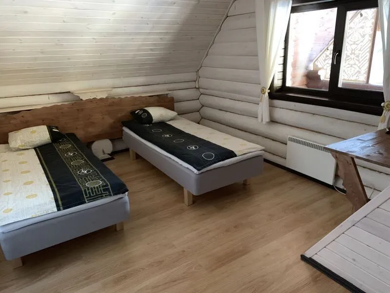 Уютный 5-местный двухэтажный коттедж со всеми удобствами и баней на дровах. Включает в себя: кухню с плитой и необходимыми кухонными принадлежностями, гостиную комнату с 2-спальным диваном и телевизором; на втором этаже расположена спальня для двухместного или трехместного размещения (в комнате располагаются 3 отдельные кровати), сан.узел с душем, баня на дровах. Семейный коттедж имеет отдельный вход с террасой, свою парковку и площадку для барбекю.