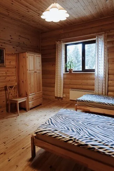 Комфортабельный коттедж для 10 человек со всеми удобствами, бильярдом и теннисным столом. Оборудован кухней со всеми необходимыми принадлежностями, чайником. На первом этаже расположена просторная гостиная с камином, большим обеденным столом, телевизором и зоной отдыха. В доме расположены 4 двухместных изолированных комнаты (возможно в любую из них поставить детскую кроватку, по запросу). 2 дополнительных спальных места можно организовать на диванах в гостиной. Сан.узел и душевые расположены на каждом этаже. Коттедж имеет собственную парковку, просторную террасу и балкон.