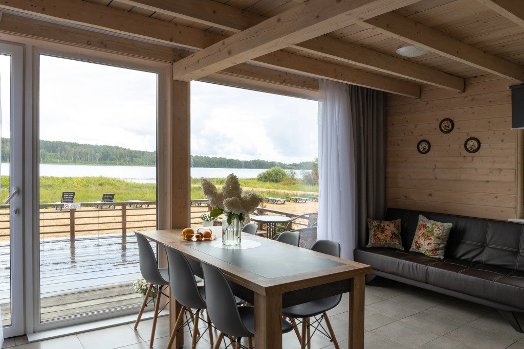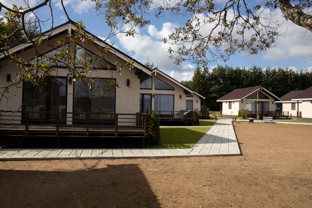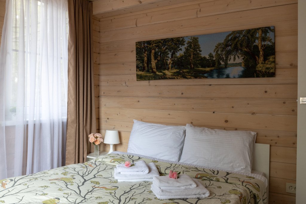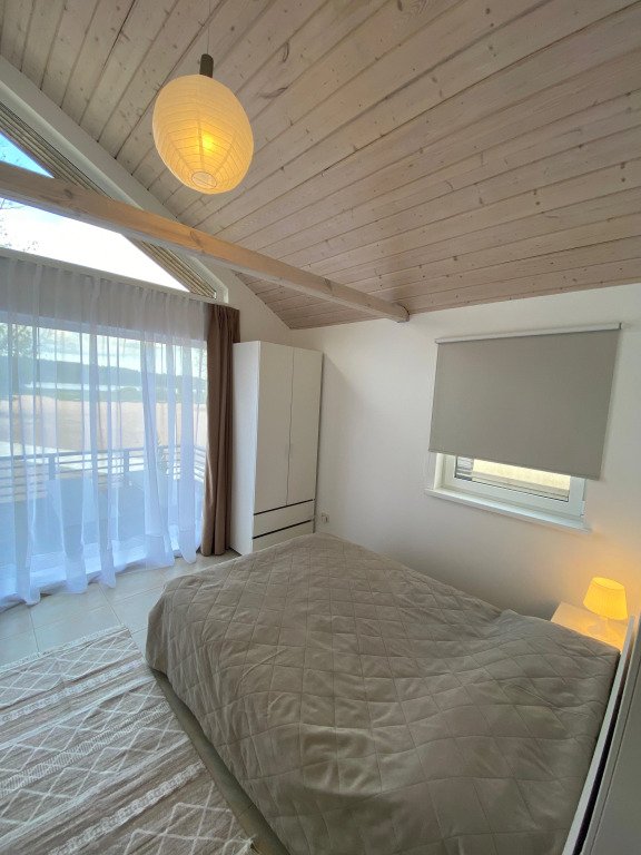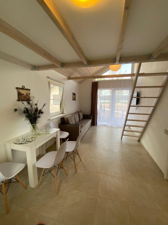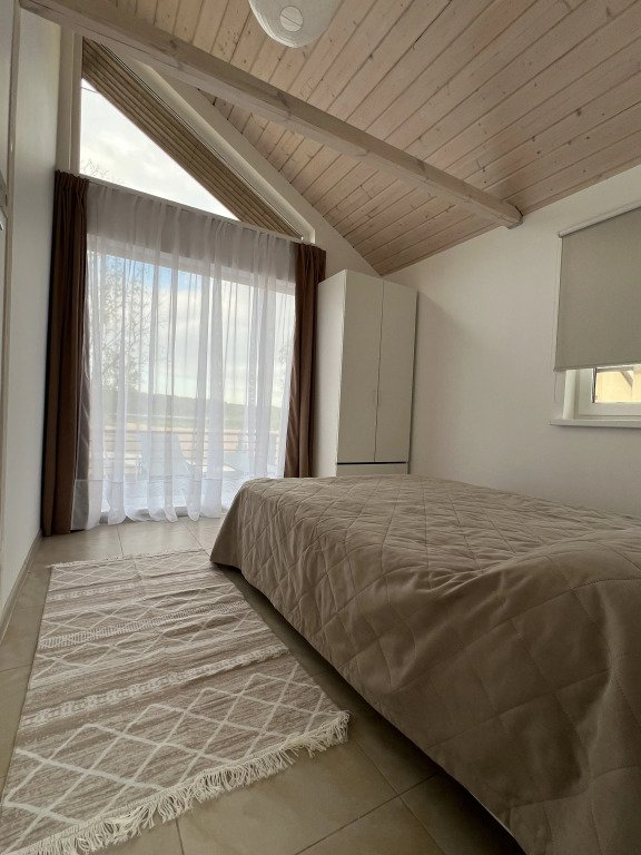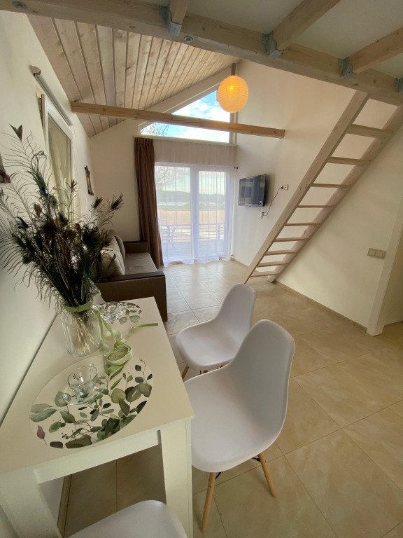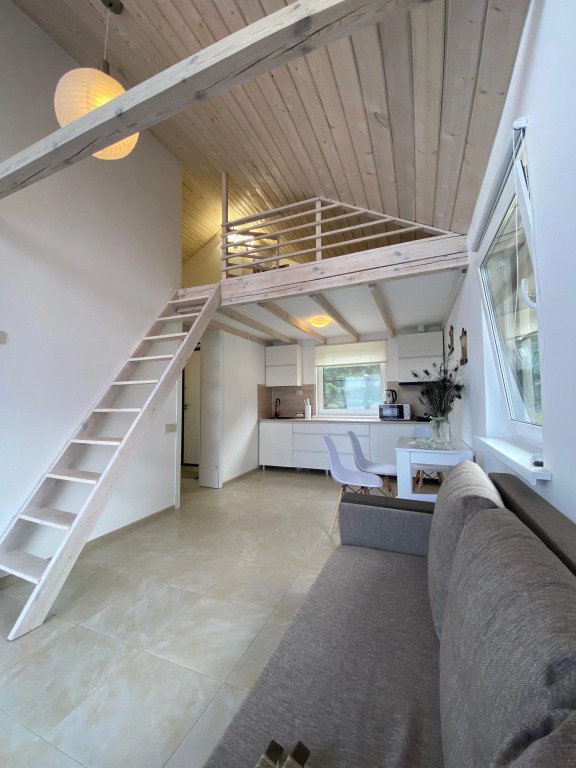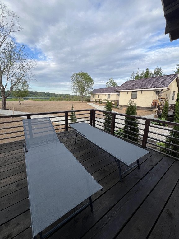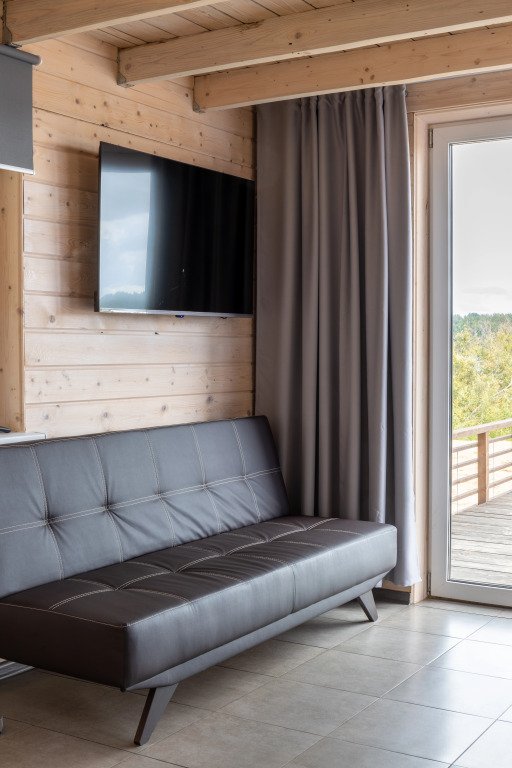 Оснащение: кухня с электрической плитой, мини-холодильник, обеденный стол и четыре стула, микроволновая печь, электрочайник, санузел с душевой кабиной, спальня с двуспальной кроватью и шкафом, зона для уличной одежды в прихожей, раскладной диван в гостиной, терраса 18 кв. м с шезлонгами, плетёной мебелью и стеклянным столом, Smart TV, Wi-Fi, система охраны Delta.