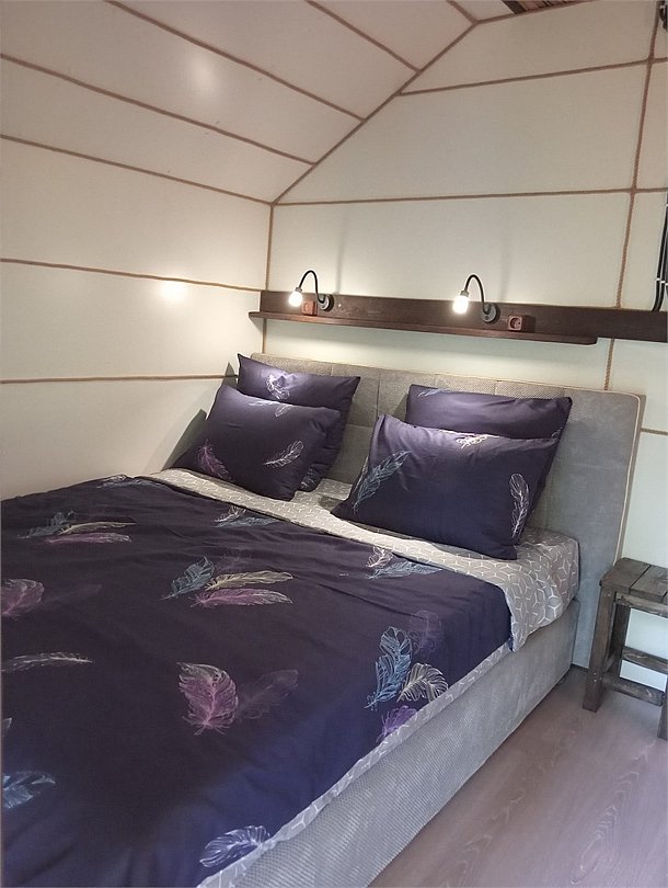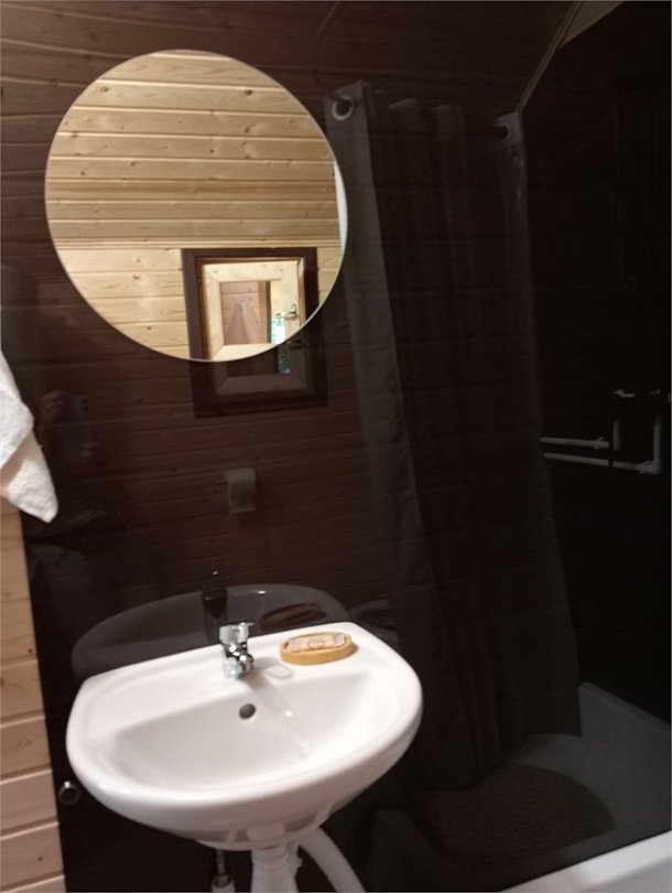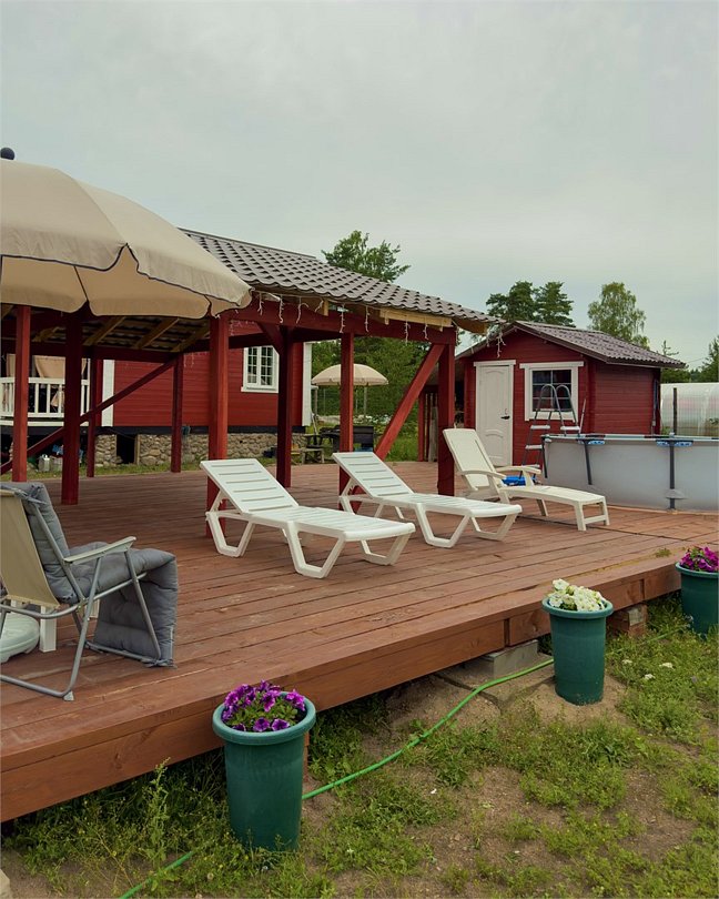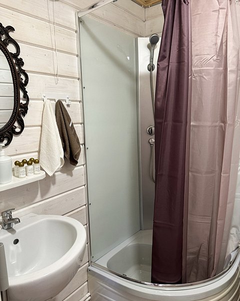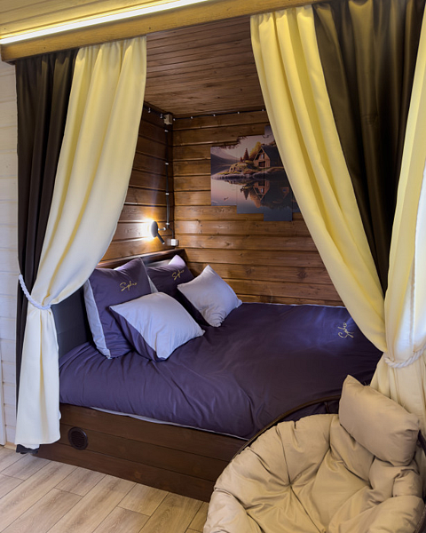 Очень уютный коттедж. Двуспальная кровать 180х200 с ортопедическим матрасом находится в спальной зоне (нише), от основного пространства огорожена плотными шторами. В доме полностью оборудованная кухня с кухонной посудой, с/у, душевая кабина, просторная терасса с мебелью, рядом с коттеджем находится собственная мангальная зона. На территории 30 соток находится зона отдыха с бассейном и шезлонгами, детский батут, бесплатная парковка, дом администрации и ещё один коттедж для отдыхающих. Охраняемая территория. Платные услуги: 1. Дополнительное спальное место 120 х 190 с постельными принадлежностями. Выдерживает нагрузку до 160 кг, вмещает 1-2 гостей в зависимости от комплекции гостя. Стоимость зависит от выбранного тарифа. 2. Доплата за животных 1000 руб за весь срок проживания (оплата при заселении) 3. Русская баня на дровах - 4000 руб/2 часа 4. Сибирский банный чан - 5000 руб без ограничения по времениУслуги и удобства