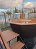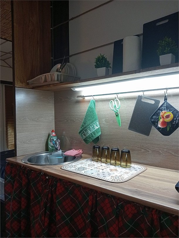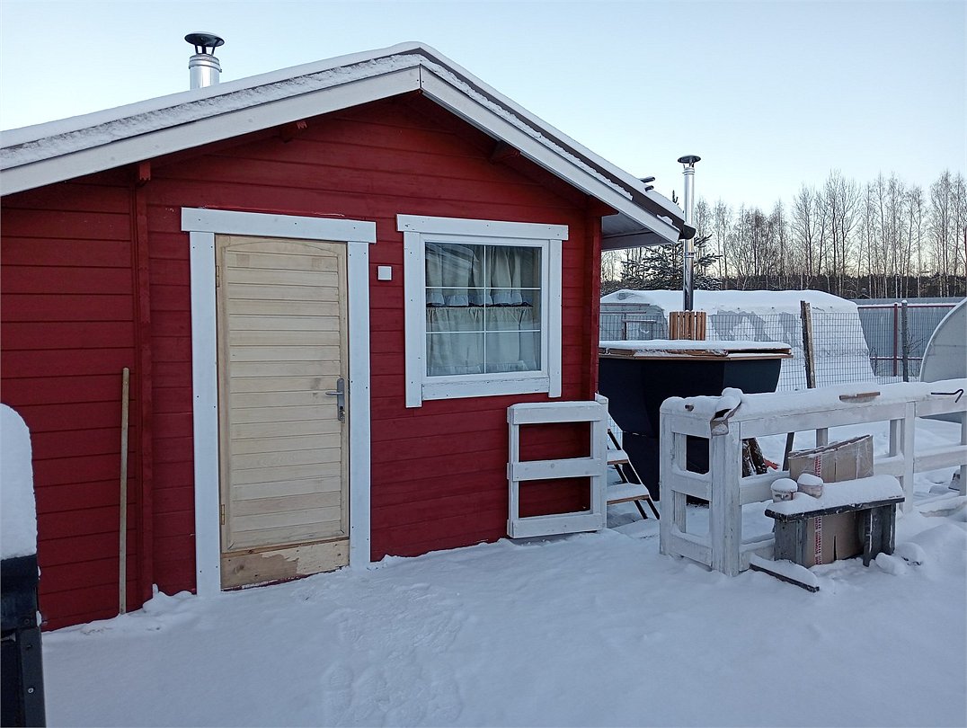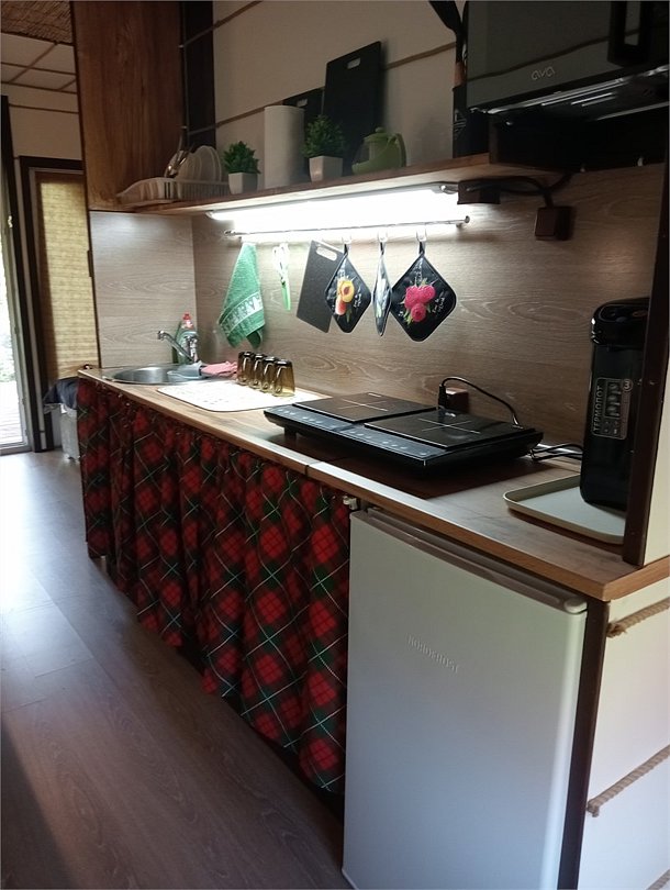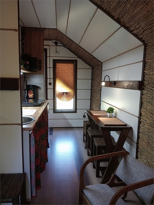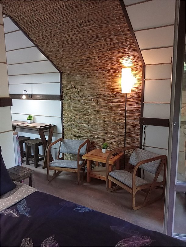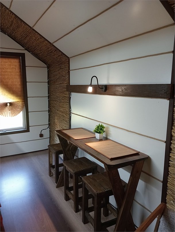 Небольшой уютный коттедж на 2 человека с возможностью установки дополнительного спального места. На улице рядом с домом парковочное место, мангал с шампурами и решеткой для барбекю, стол с зонтом и скамейками.
