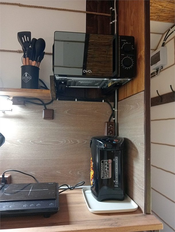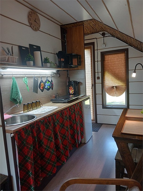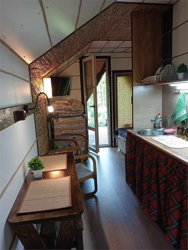В доме большая двуспальная кровать, два кресла с журнальным столиком. На кухне есть необходимая посуда и техника для приготовления пищи. Санузел в доме.
