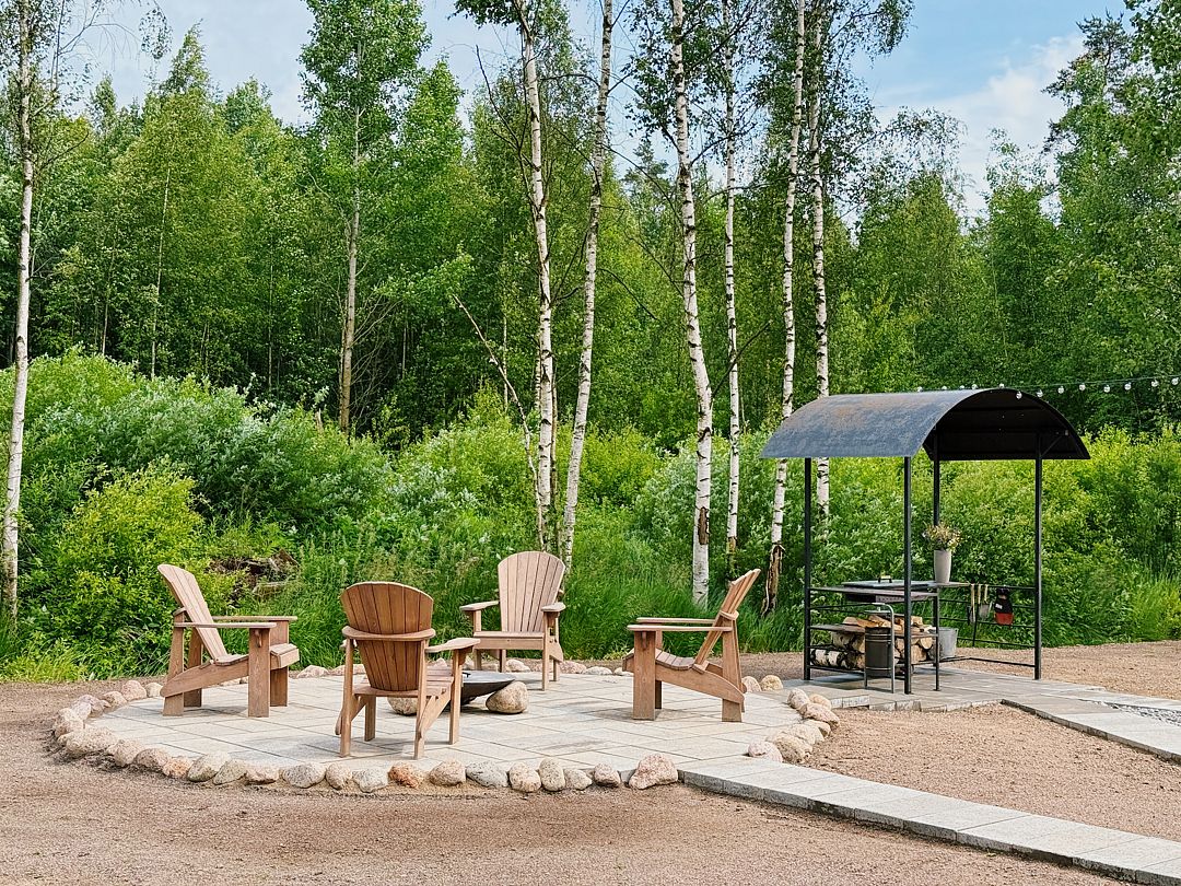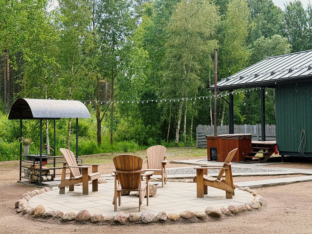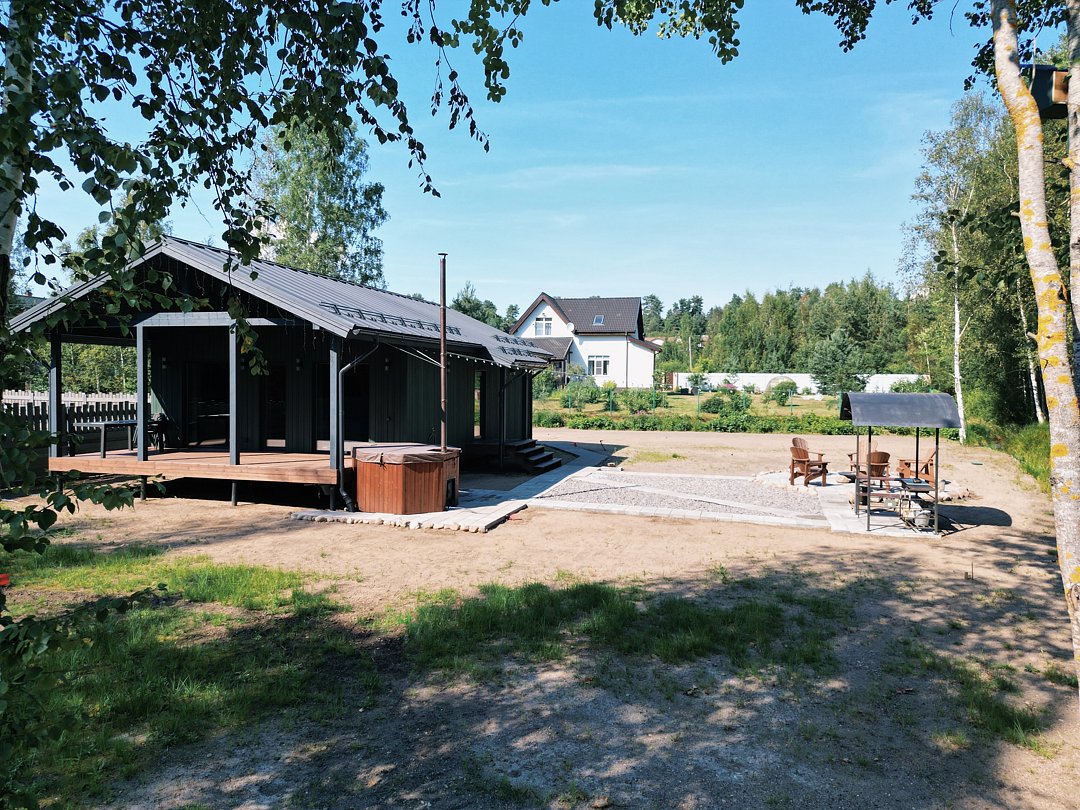 Расположен рядом с лесом, на прилегающей территории есть горячая купель с гидромассажем и подсветкой, зона отдыха у костра с мягкими креслами и открытый мангал.