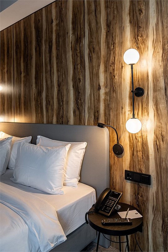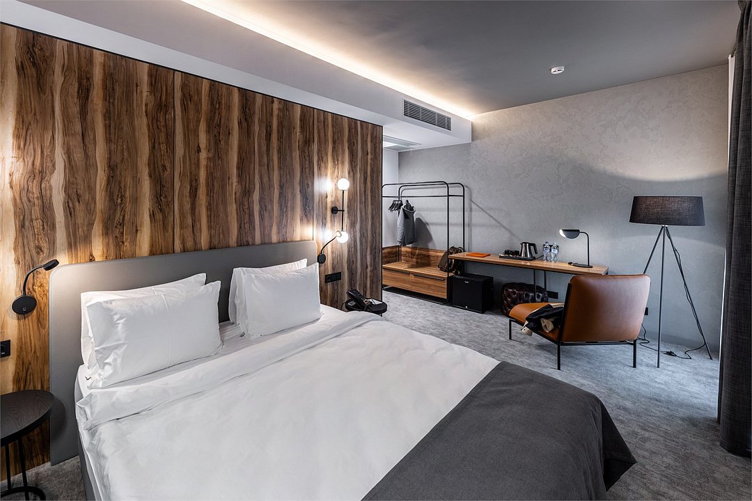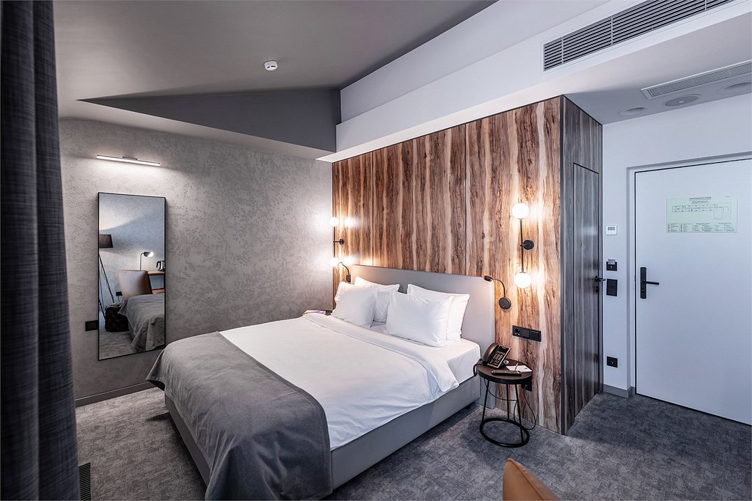 Однокомнатный номер средней площадью 20 кв.м. В номере: Двуспальная кровать (180х200); Вид окна: в пол или панорамное; Место для работы; Чайная станция; Спутниковое телевидение; Телефон; Бесплатный выход в Интернет; Мини-холодильник; Регулируемая тепло-вентиляционная система; Ванная комната (фен, косметические средства).Услуги и удобства