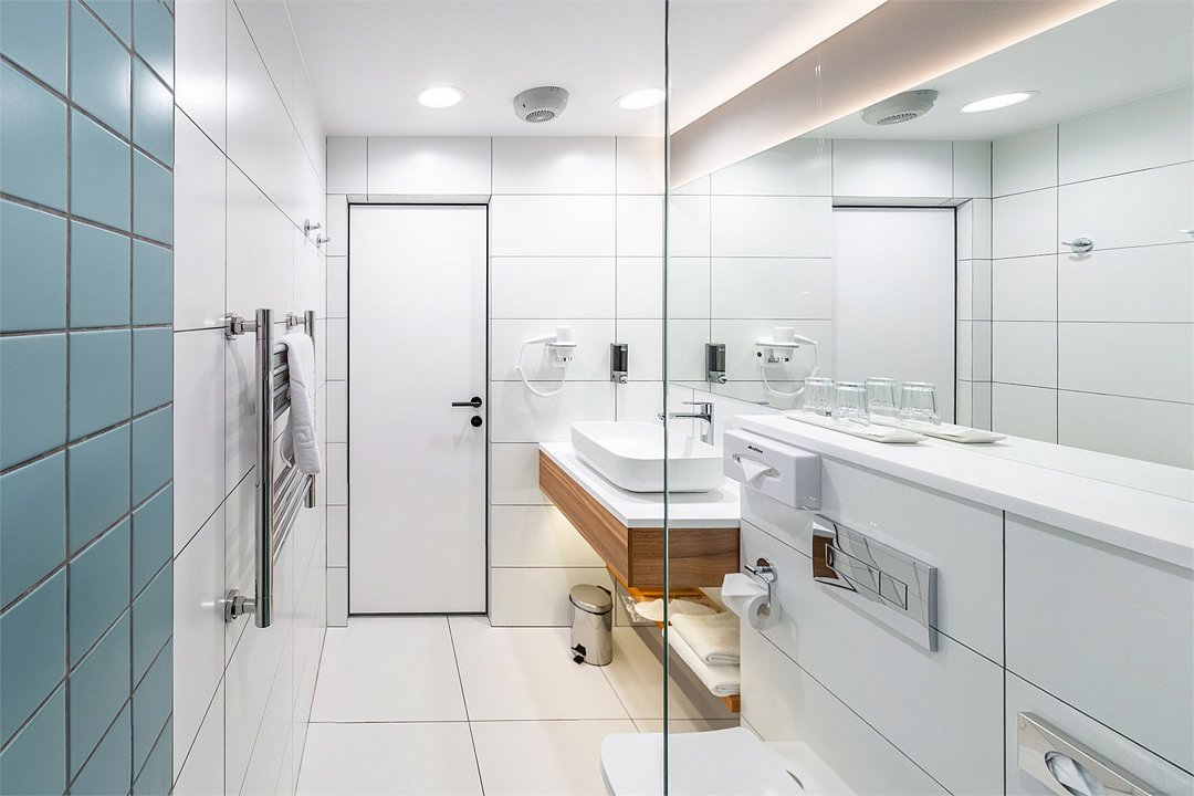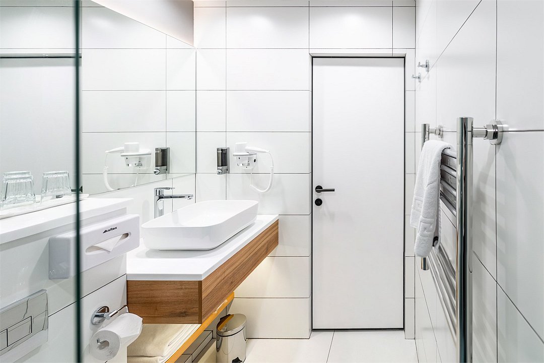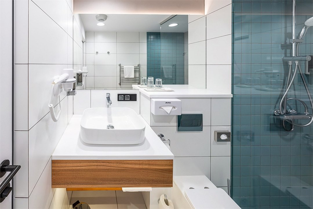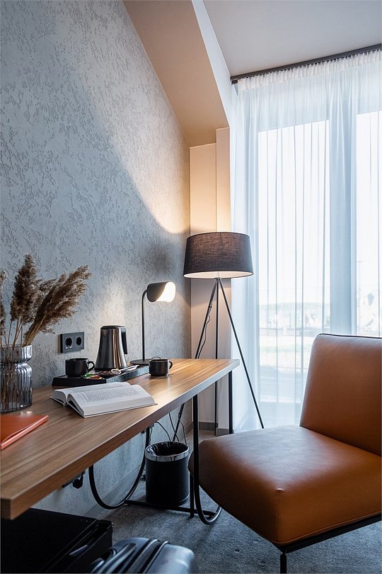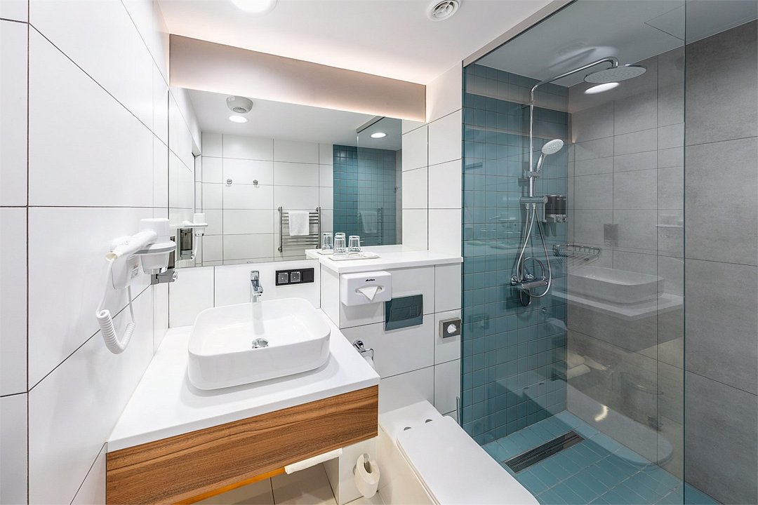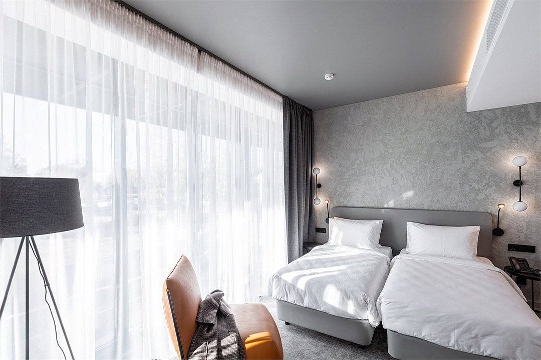 Однокомнатный номер средней площадью 20 кв.м. В номере: Две кровати (90х200); Вид окна: в пол или панорамное; Место для работы; Чайная станция; Спутниковое телевидение; Телефон; Бесплатный выход в Интернет; Мини-холодильник; Регулируемая тепло-вентиляционная система; Ванная комната (фен, косметические средства).Услуги и удобства