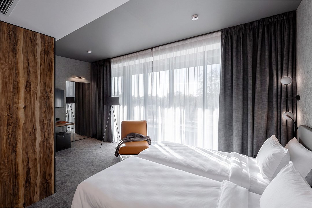 Однокомнатный номер общей площадью 20 кв.м. с видом на озеро. В номере: одна большая кровать или две раздельные кровати Две кровати (90х200); Окно в пол; Место для работы; Чайная станция; Спутниковое телевидение; Телефон; Бесплатный выход в Интернет; Мини-холодильник; Регулируемая тепло-вентиляционная система; Ванная комната (фен, косметические средства).Услуги и удобства