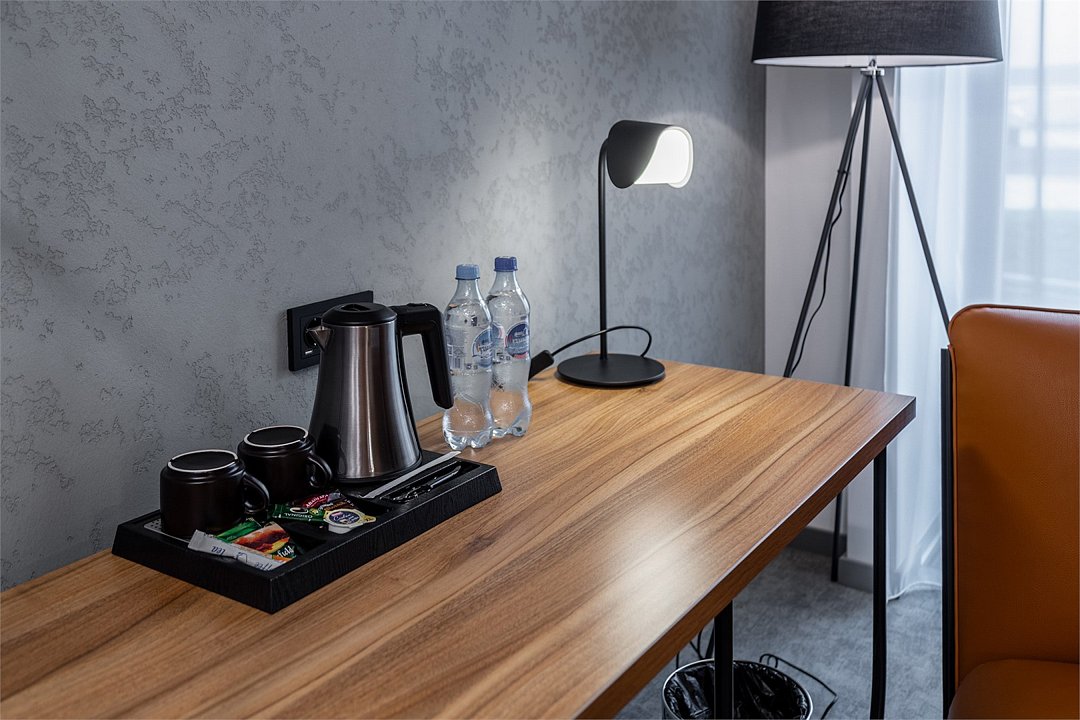 телевизор, спутниковое телевидение, Wi-Fi, телефон, кондиционер, светильник, настольные лампы, фен, электронные замки, утюг, ванная комната, санузел, халаты, банные полотенца, тапочки, косметические средства, две односпальные кровати, гладильная доска, вешалки, багажная тумба, зеркало, письменные принадлежности, информационная карта, меню, минеральная вода, унитаз, раковина, ковровое покрытие, вид на город, кулер на этаже, кресло, мини-холодильник, пуфик, рабочий стол, чайная станция, уборка номера, набор для приготовления чая и кофе, затемняющая штора, дождевой и ручной душ, можно с питомцамиВ номере